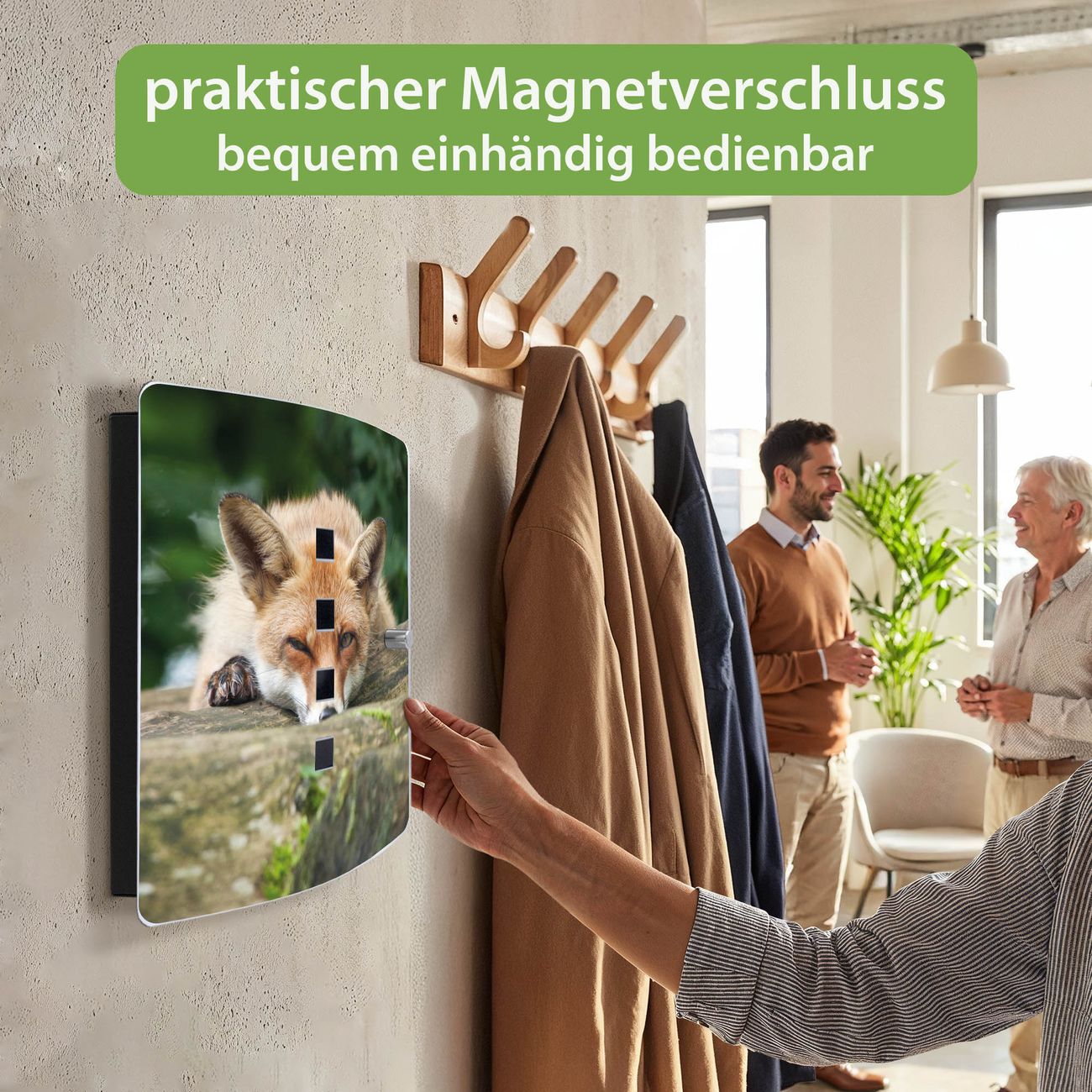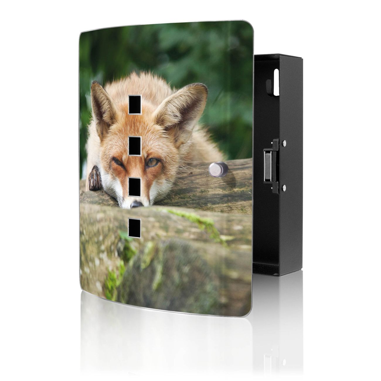 Funktion / Nutzen: Die leicht geschwungene Edelstahltür ist mit einer hochwertigen Motivfolie und dem Motiv Motiv Fuchs Relax kaschiert. Ein praktischer Magnetverschluss ermöglicht Ihnen ein schnelles Öffnen und Schließen. Befestigt wird der Schlüsselkasten an 2 Stellen auf der Rückseite, passendes Montagematerial fügen wir bereits bei.