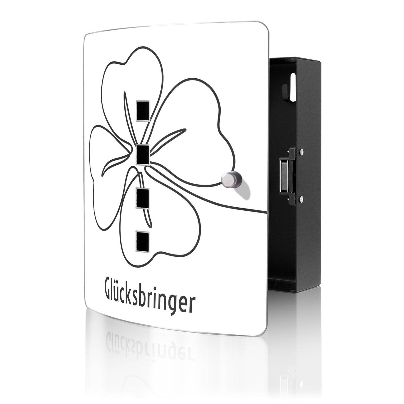 Funktion / Nutzen: Die leicht geschwungene Edelstahltür ist mit einer hochwertigen Motivfolie und dem Motiv Motiv Glücksbringer Kleeblatt 2 kaschiert. Ein praktischer Magnetverschluss ermöglicht Ihnen ein schnelles Öffnen und Schließen. Befestigt wird der Schlüsselkasten an 2 Stellen auf der Rückseite, passendes Montagematerial fügen wir bereits bei.