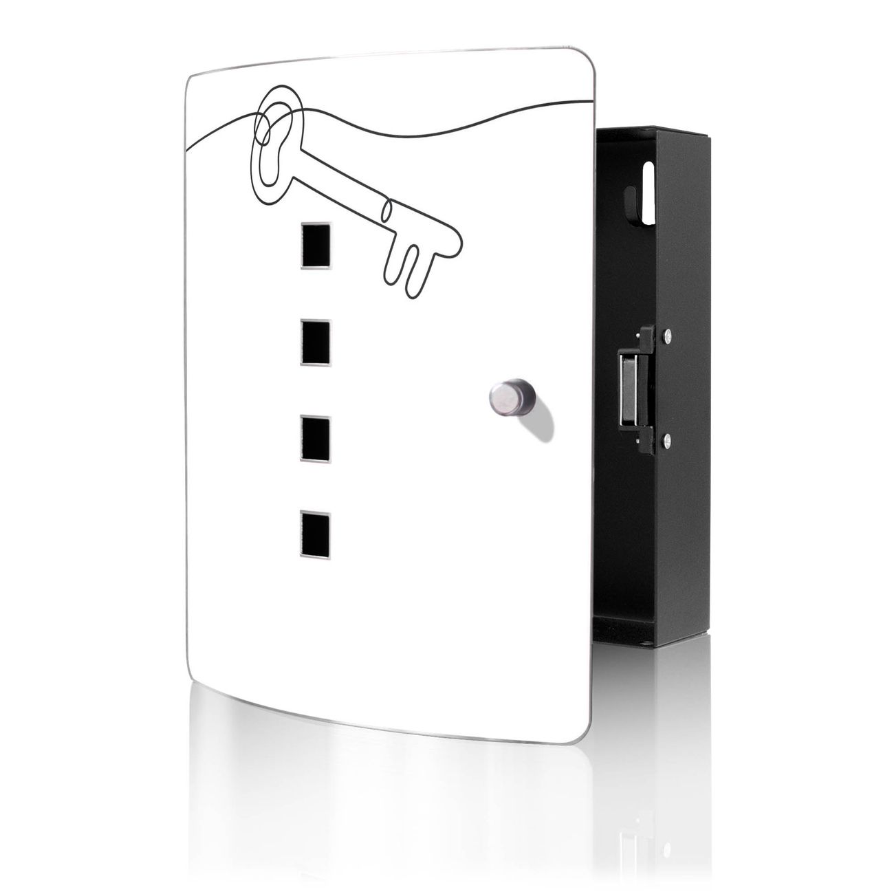Funktion / Nutzen: Die leicht geschwungene Edelstahltür ist mit einer hochwertigen Motivfolie und dem Motiv Motiv Hausherr Schlüssel 2 kaschiert. Ein praktischer Magnetverschluss ermöglicht Ihnen ein schnelles Öffnen und Schließen. Befestigt wird der Schlüsselkasten an 2 Stellen auf der Rückseite, passendes Montagematerial fügen wir bereits bei.