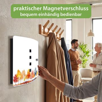 Funktion / Nutzen: Die leicht geschwungene Edelstahltür ist mit einer hochwertigen Motivfolie und dem Motiv Motiv Herbstlicher Baumzauber kaschiert. Ein praktischer Magnetverschluss ermöglicht Ihnen ein schnelles Öffnen und Schließen. Befestigt wird der Schlüsselkasten an 2 Stellen auf der Rückseite, passendes Montagematerial fügen wir bereits bei.