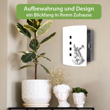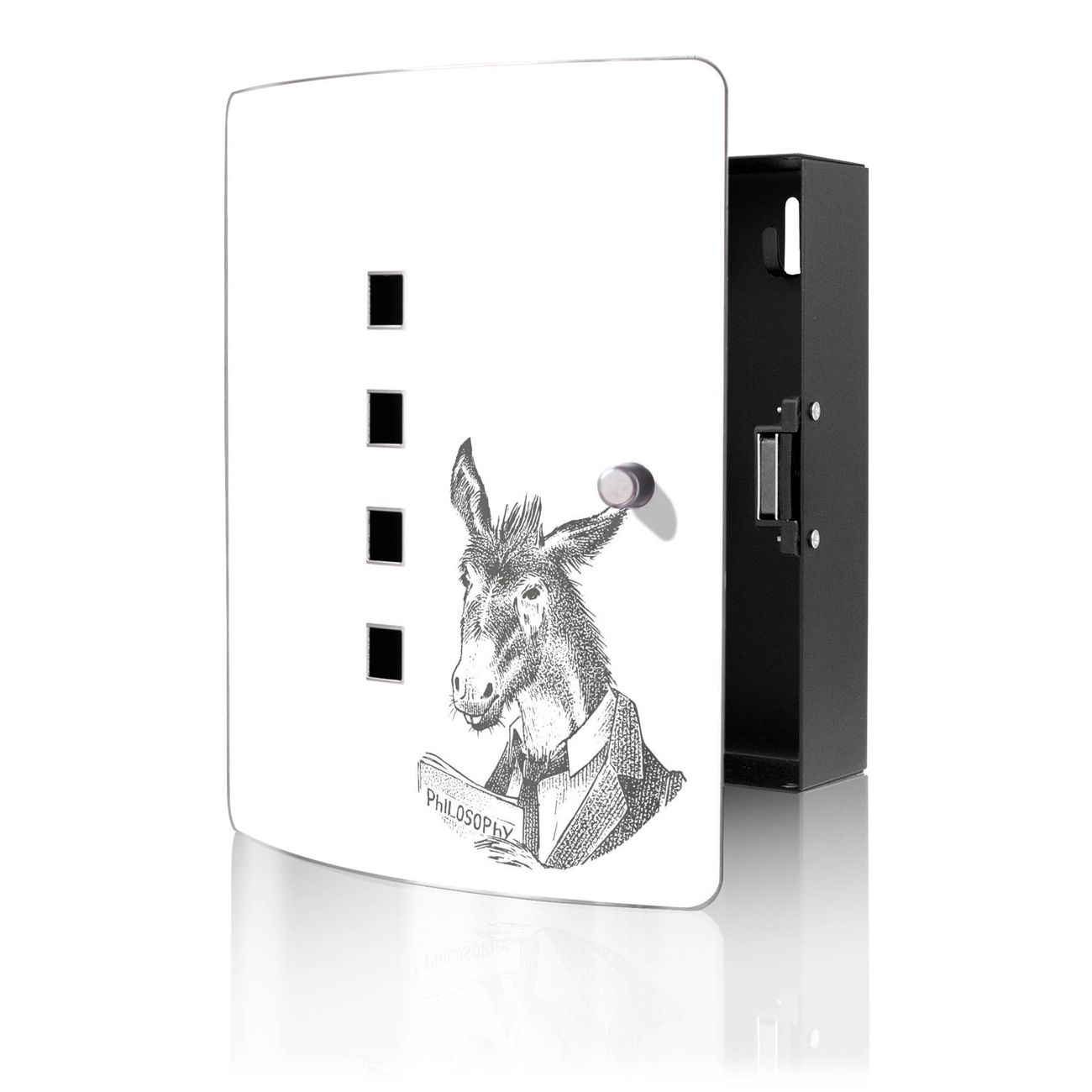 Funktion / Nutzen: Die leicht geschwungene Edelstahltür ist mit einer hochwertigen Motivfolie und dem Motiv Motiv Herr Esel 2 kaschiert. Ein praktischer Magnetverschluss ermöglicht Ihnen ein schnelles Öffnen und Schließen. Befestigt wird der Schlüsselkasten an 2 Stellen auf der Rückseite, passendes Montagematerial fügen wir bereits bei.