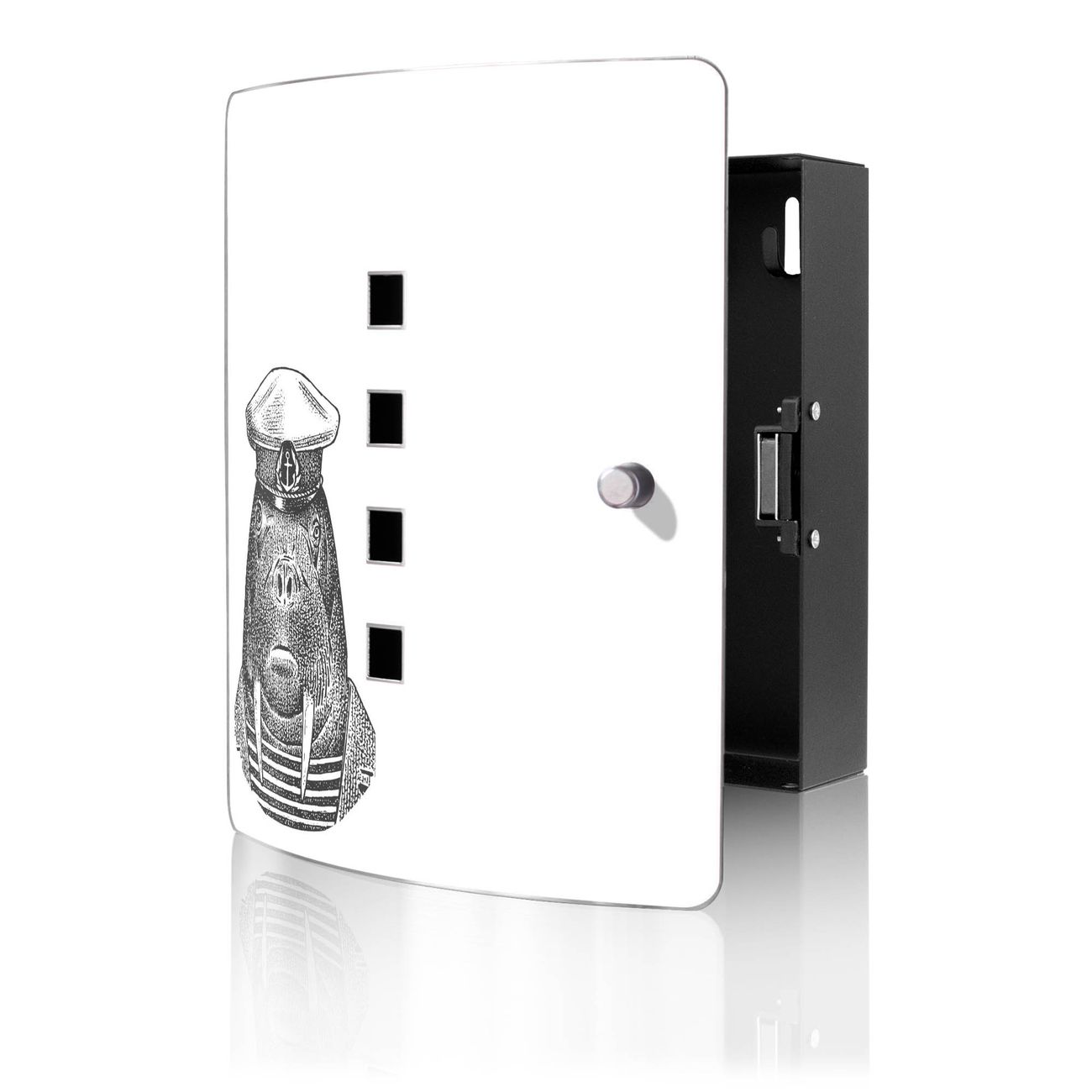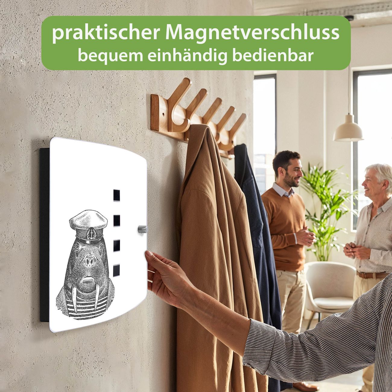 Funktion / Nutzen: Die leicht geschwungene Edelstahltür ist mit einer hochwertigen Motivfolie und dem Motiv Motiv Herr Walross 2 kaschiert. Ein praktischer Magnetverschluss ermöglicht Ihnen ein schnelles Öffnen und Schließen. Befestigt wird der Schlüsselkasten an 2 Stellen auf der Rückseite, passendes Montagematerial fügen wir bereits bei.