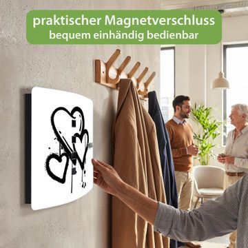 Funktion / Nutzen: Die leicht geschwungene Edelstahltür ist mit einer hochwertigen Motivfolie und dem Motiv Motiv Herzen Graffiti kaschiert. Ein praktischer Magnetverschluss ermöglicht Ihnen ein schnelles Öffnen und Schließen. Befestigt wird der Schlüsselkasten an 2 Stellen auf der Rückseite, passendes Montagematerial fügen wir bereits bei.