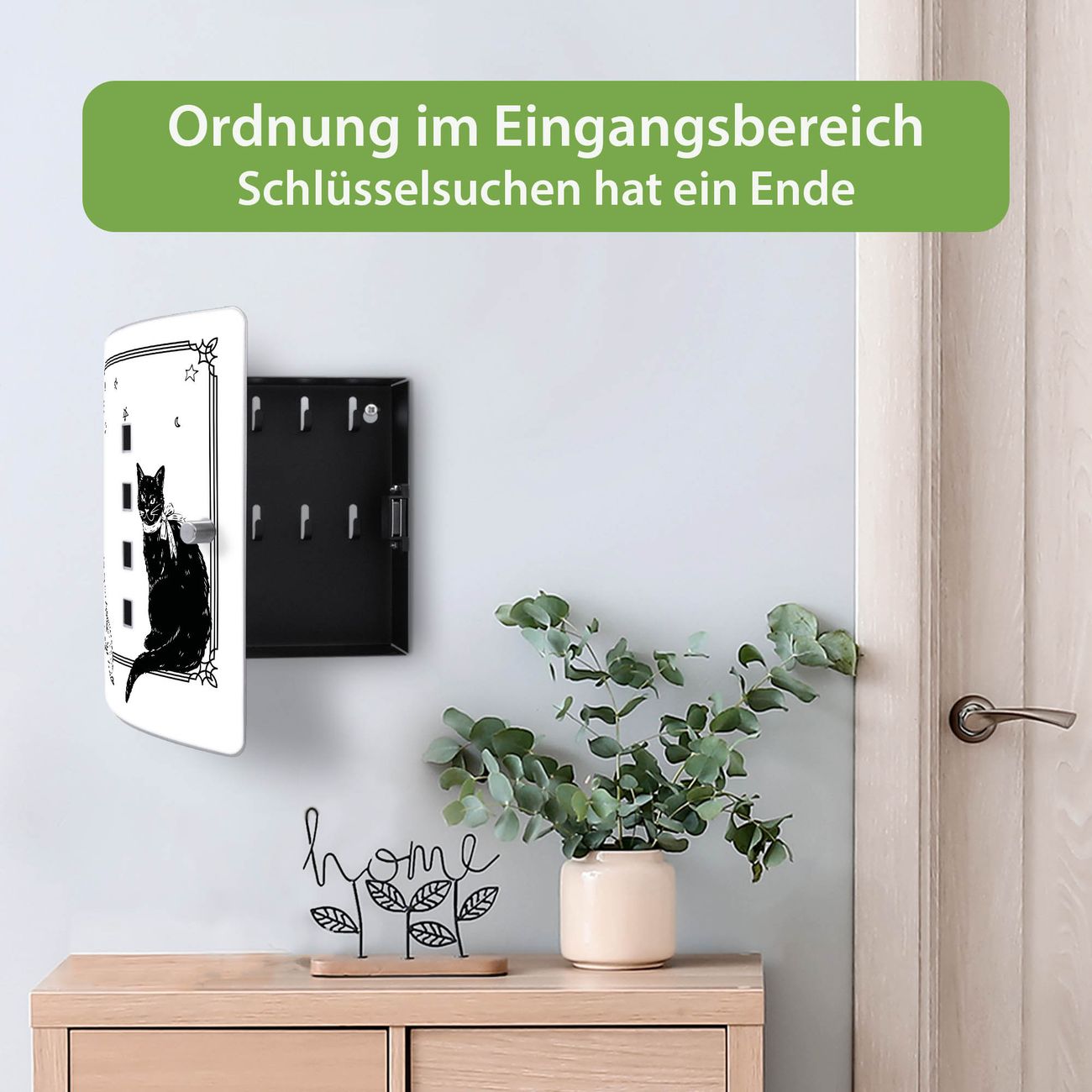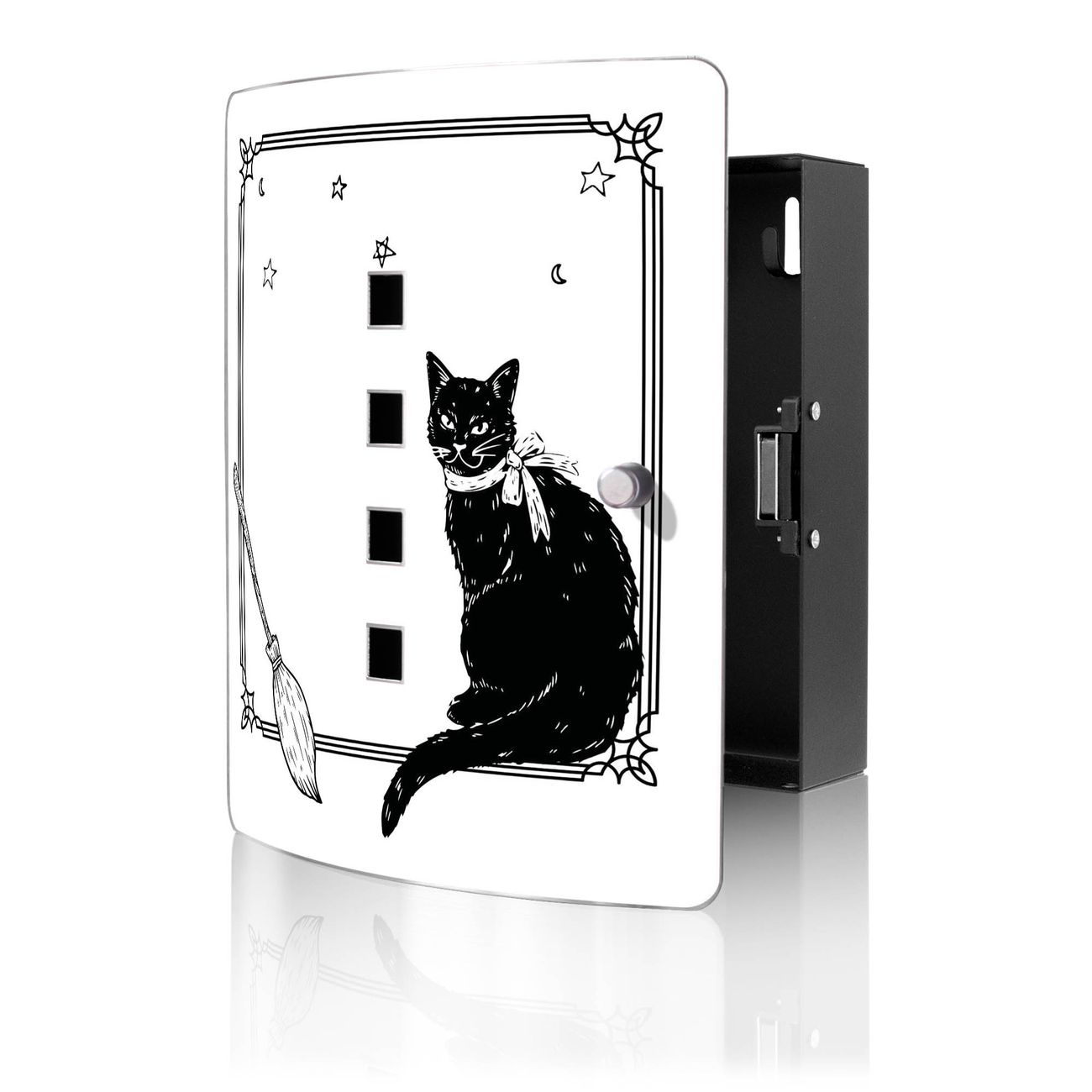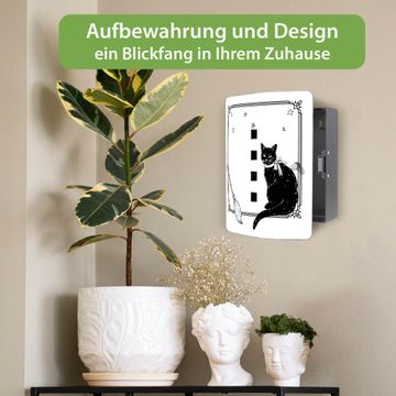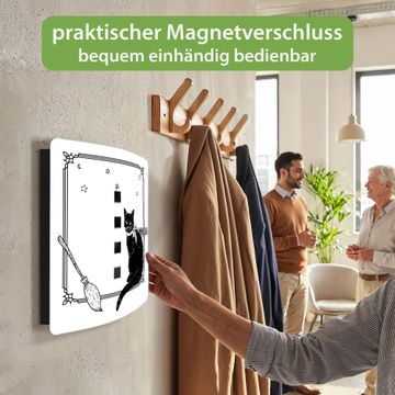 Funktion / Nutzen: Die leicht geschwungene Edelstahltür ist mit einer hochwertigen Motivfolie und dem Motiv Motiv Hexen und Kater kaschiert. Ein praktischer Magnetverschluss ermöglicht Ihnen ein schnelles Öffnen und Schließen. Befestigt wird der Schlüsselkasten an 2 Stellen auf der Rückseite, passendes Montagematerial fügen wir bereits bei.