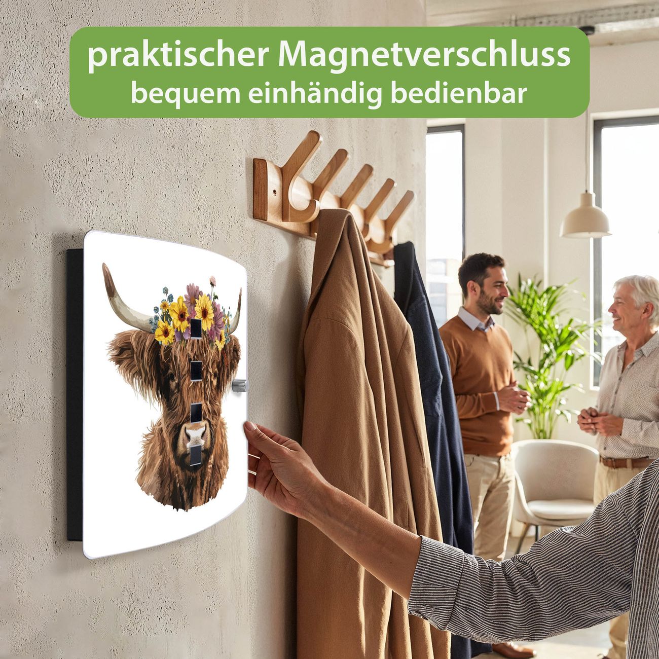 Funktion / Nutzen: Die leicht geschwungene Edelstahltür ist mit einer hochwertigen Motivfolie und dem Motiv Motiv Hochlandkuh mit Blumenkrone kaschiert. Ein praktischer Magnetverschluss ermöglicht Ihnen ein schnelles Öffnen und Schließen. Befestigt wird der Schlüsselkasten an 2 Stellen auf der Rückseite, passendes Montagematerial fügen wir bereits bei.