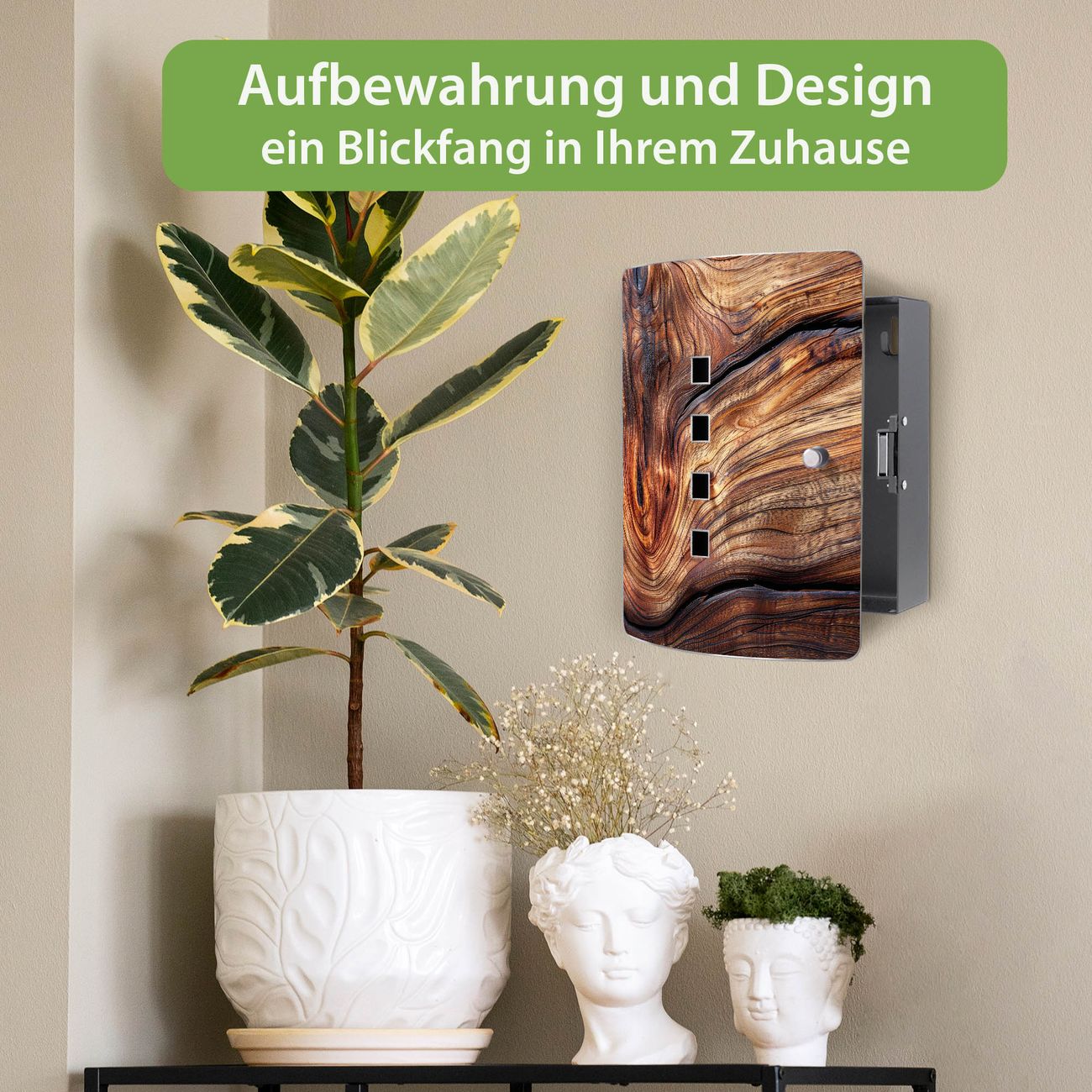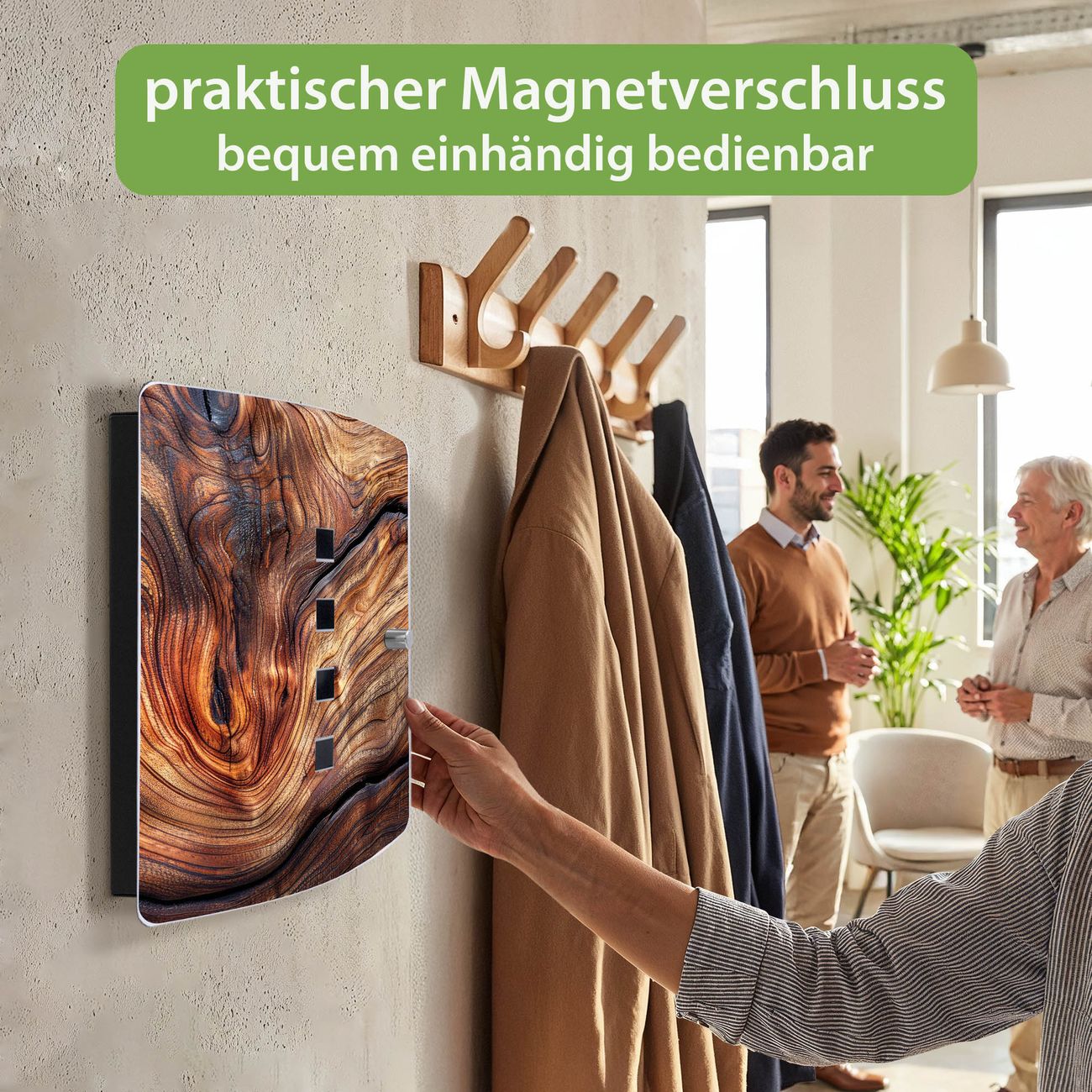 Funktion / Nutzen: Die leicht geschwungene Edelstahltür ist mit einer hochwertigen Motivfolie und dem Motiv Motiv Holz Gemasert Kurve kaschiert. Ein praktischer Magnetverschluss ermöglicht Ihnen ein schnelles Öffnen und Schließen. Befestigt wird der Schlüsselkasten an 2 Stellen auf der Rückseite, passendes Montagematerial fügen wir bereits bei.