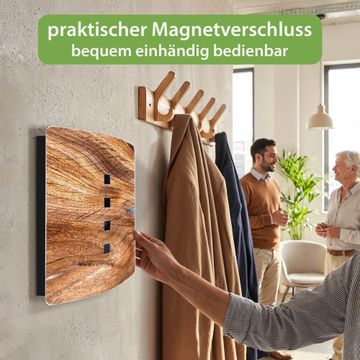 Funktion / Nutzen: Die leicht geschwungene Edelstahltür ist mit einer hochwertigen Motivfolie und dem Motiv Motiv Holz Struktur Fließend kaschiert. Ein praktischer Magnetverschluss ermöglicht Ihnen ein schnelles Öffnen und Schließen. Befestigt wird der Schlüsselkasten an 2 Stellen auf der Rückseite, passendes Montagematerial fügen wir bereits bei.