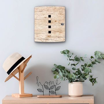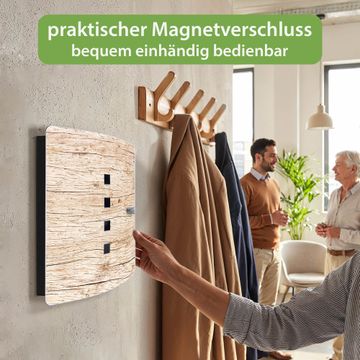 Funktion / Nutzen: Die leicht geschwungene Edelstahltür ist mit einer hochwertigen Motivfolie und dem Motiv Motiv Holz Struktur Hell kaschiert. Ein praktischer Magnetverschluss ermöglicht Ihnen ein schnelles Öffnen und Schließen. Befestigt wird der Schlüsselkasten an 2 Stellen auf der Rückseite, passendes Montagematerial fügen wir bereits bei.
