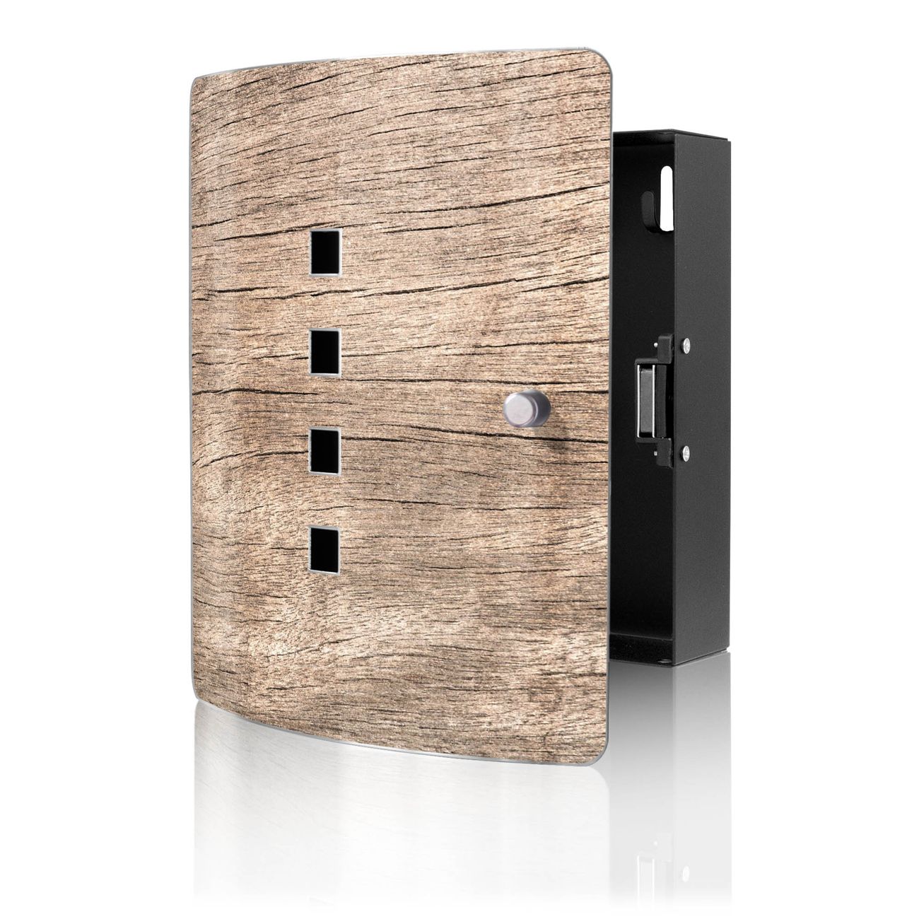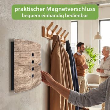 Funktion / Nutzen: Die leicht geschwungene Edelstahltür ist mit einer hochwertigen Motivfolie und dem Motiv Motiv Holz Struktur Warmgrau kaschiert. Ein praktischer Magnetverschluss ermöglicht Ihnen ein schnelles Öffnen und Schließen. Befestigt wird der Schlüsselkasten an 2 Stellen auf der Rückseite, passendes Montagematerial fügen wir bereits bei.