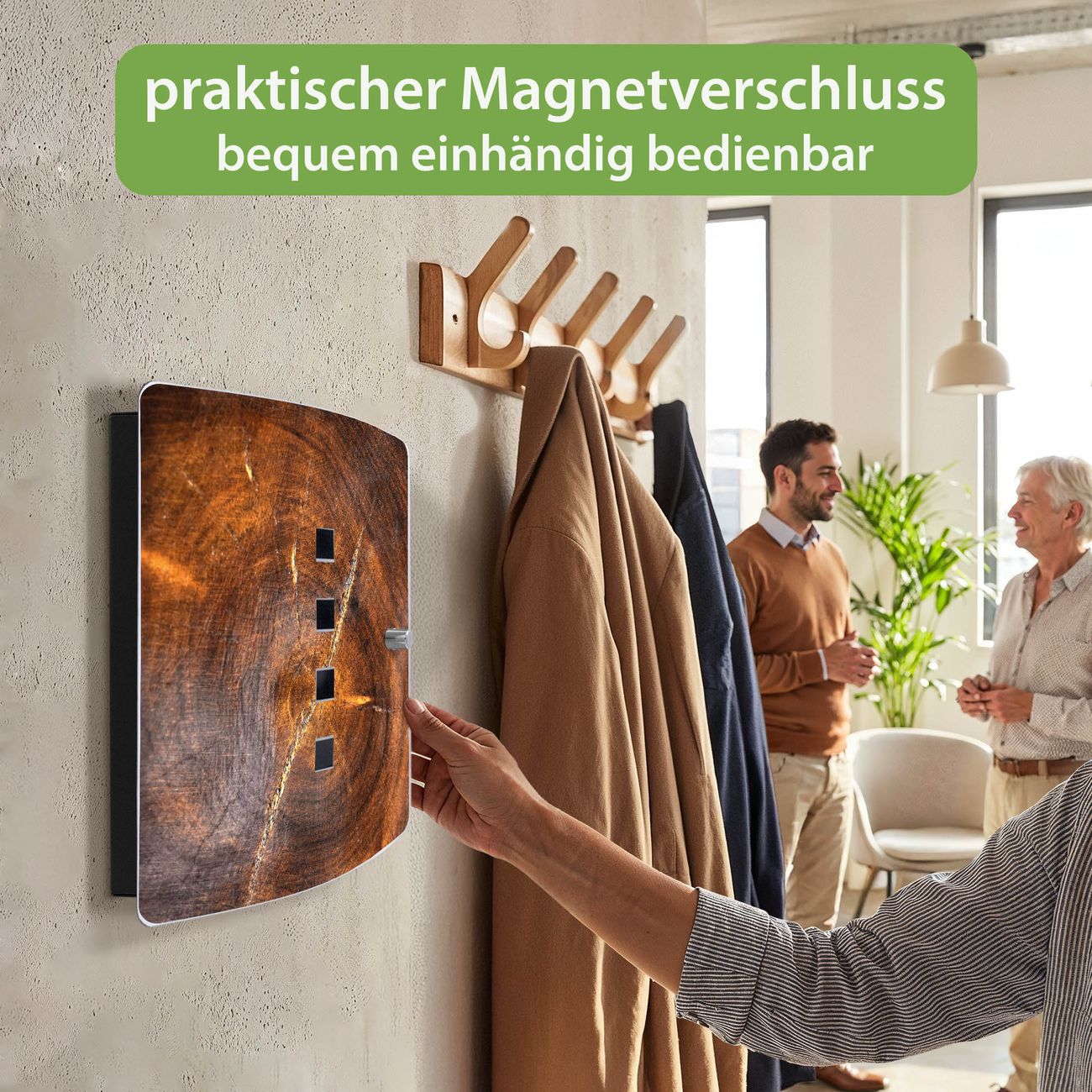 Funktion / Nutzen: Die leicht geschwungene Edelstahltür ist mit einer hochwertigen Motivfolie und dem Motiv Motiv Holzring mit Rissen kaschiert. Ein praktischer Magnetverschluss ermöglicht Ihnen ein schnelles Öffnen und Schließen. Befestigt wird der Schlüsselkasten an 2 Stellen auf der Rückseite, passendes Montagematerial fügen wir bereits bei.