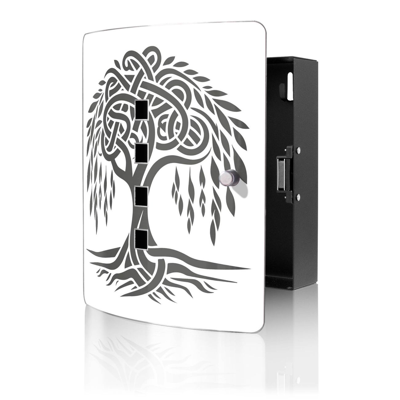 Funktion / Nutzen: Die leicht geschwungene Edelstahltür ist mit einer hochwertigen Motivfolie und dem Motiv Motiv Keltischer Baum des Lebens kaschiert. Ein praktischer Magnetverschluss ermöglicht Ihnen ein schnelles Öffnen und Schließen. Befestigt wird der Schlüsselkasten an 2 Stellen auf der Rückseite, passendes Montagematerial fügen wir bereits bei.