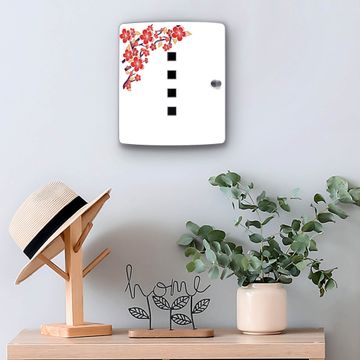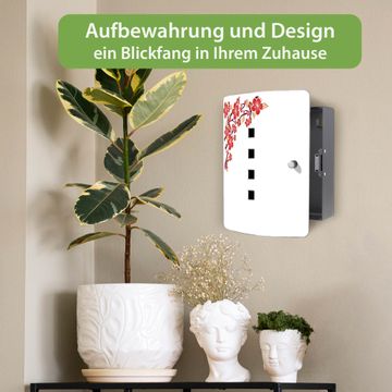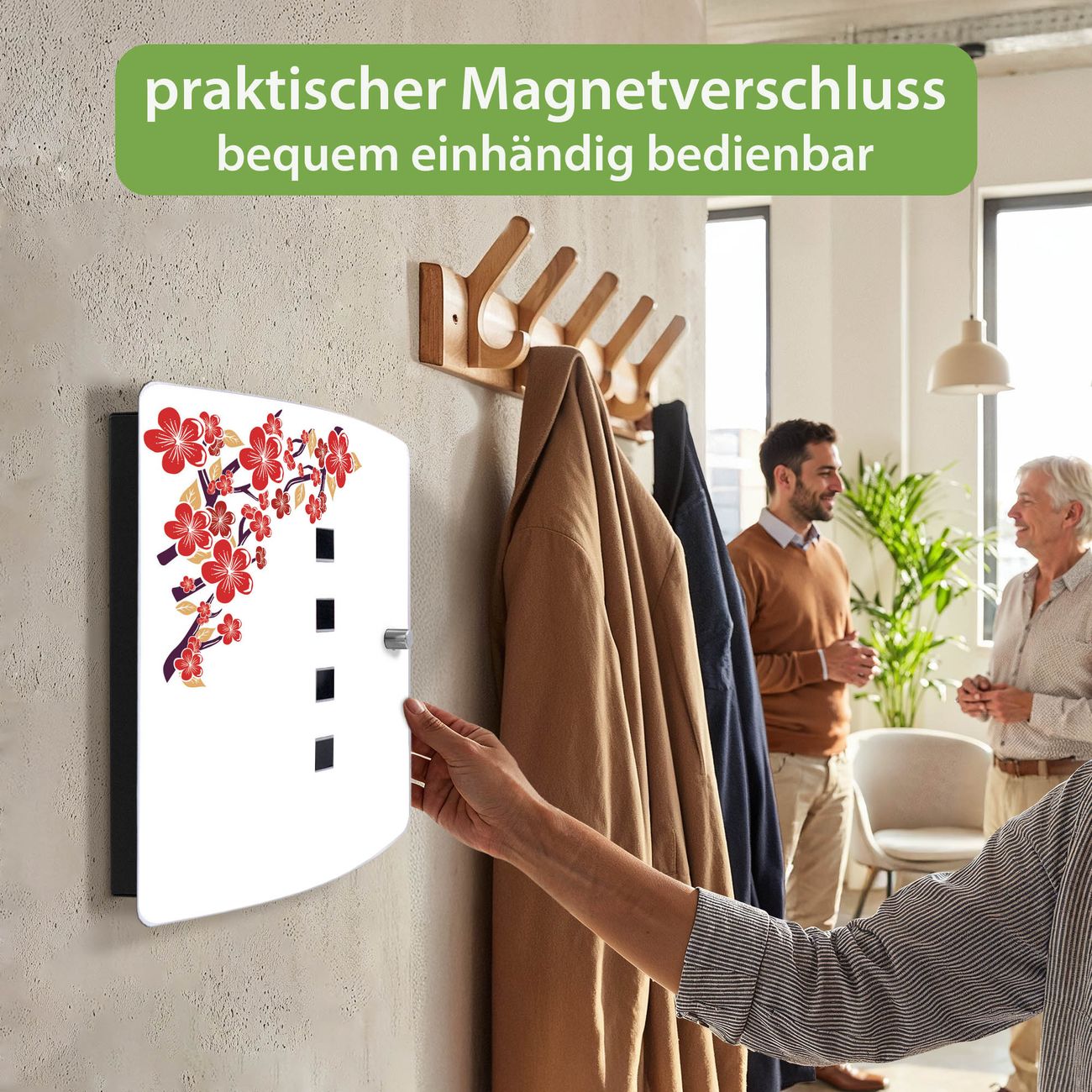 Funktion / Nutzen: Die leicht geschwungene Edelstahltür ist mit einer hochwertigen Motivfolie und dem Motiv Motiv Kirschblütenmuster kaschiert. Ein praktischer Magnetverschluss ermöglicht Ihnen ein schnelles Öffnen und Schließen. Befestigt wird der Schlüsselkasten an 2 Stellen auf der Rückseite, passendes Montagematerial fügen wir bereits bei.