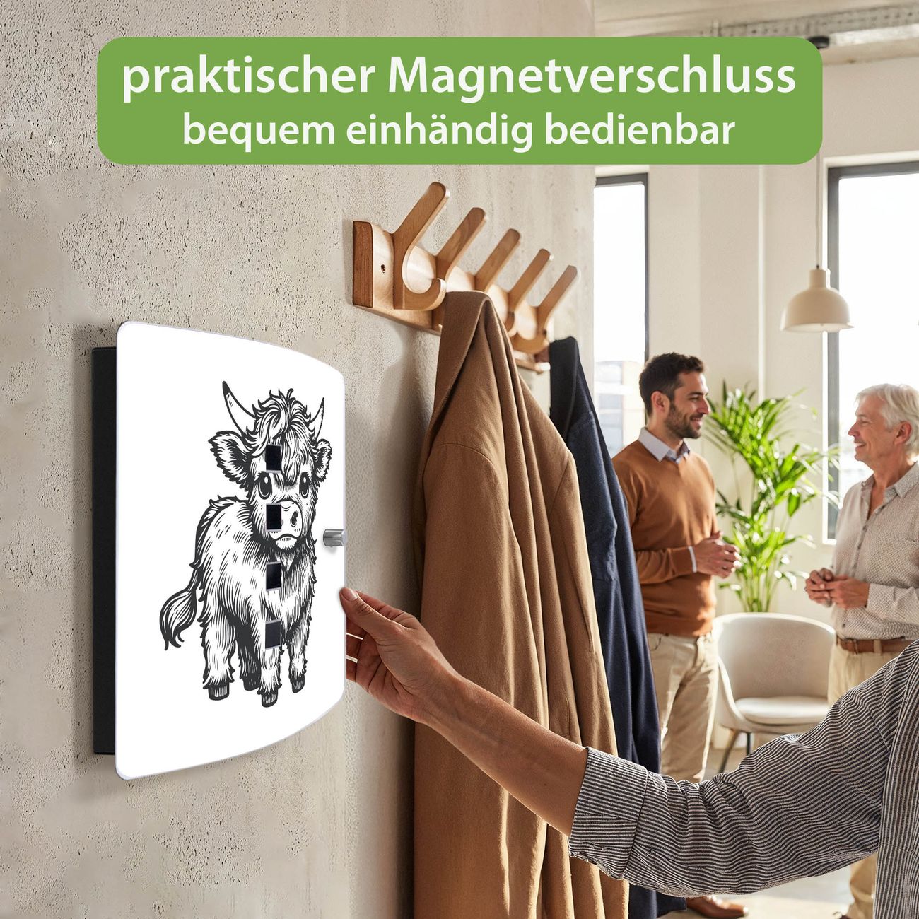 Funktion / Nutzen: Die leicht geschwungene Edelstahltür ist mit einer hochwertigen Motivfolie und dem Motiv Motiv Kleines Hochlandrind Zeichnung kaschiert. Ein praktischer Magnetverschluss ermöglicht Ihnen ein schnelles Öffnen und Schließen. Befestigt wird der Schlüsselkasten an 2 Stellen auf der Rückseite, passendes Montagematerial fügen wir bereits bei.