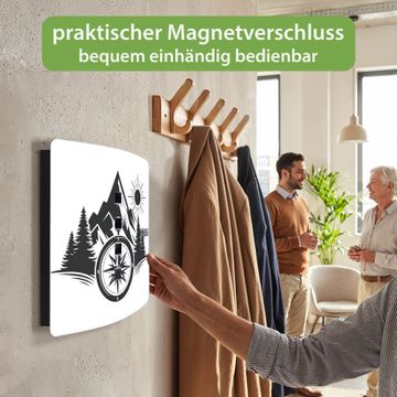 Funktion / Nutzen: Die leicht geschwungene Edelstahltür ist mit einer hochwertigen Motivfolie und dem Motiv Motiv Kompass in der Wildnis kaschiert. Ein praktischer Magnetverschluss ermöglicht Ihnen ein schnelles Öffnen und Schließen. Befestigt wird der Schlüsselkasten an 2 Stellen auf der Rückseite, passendes Montagematerial fügen wir bereits bei.