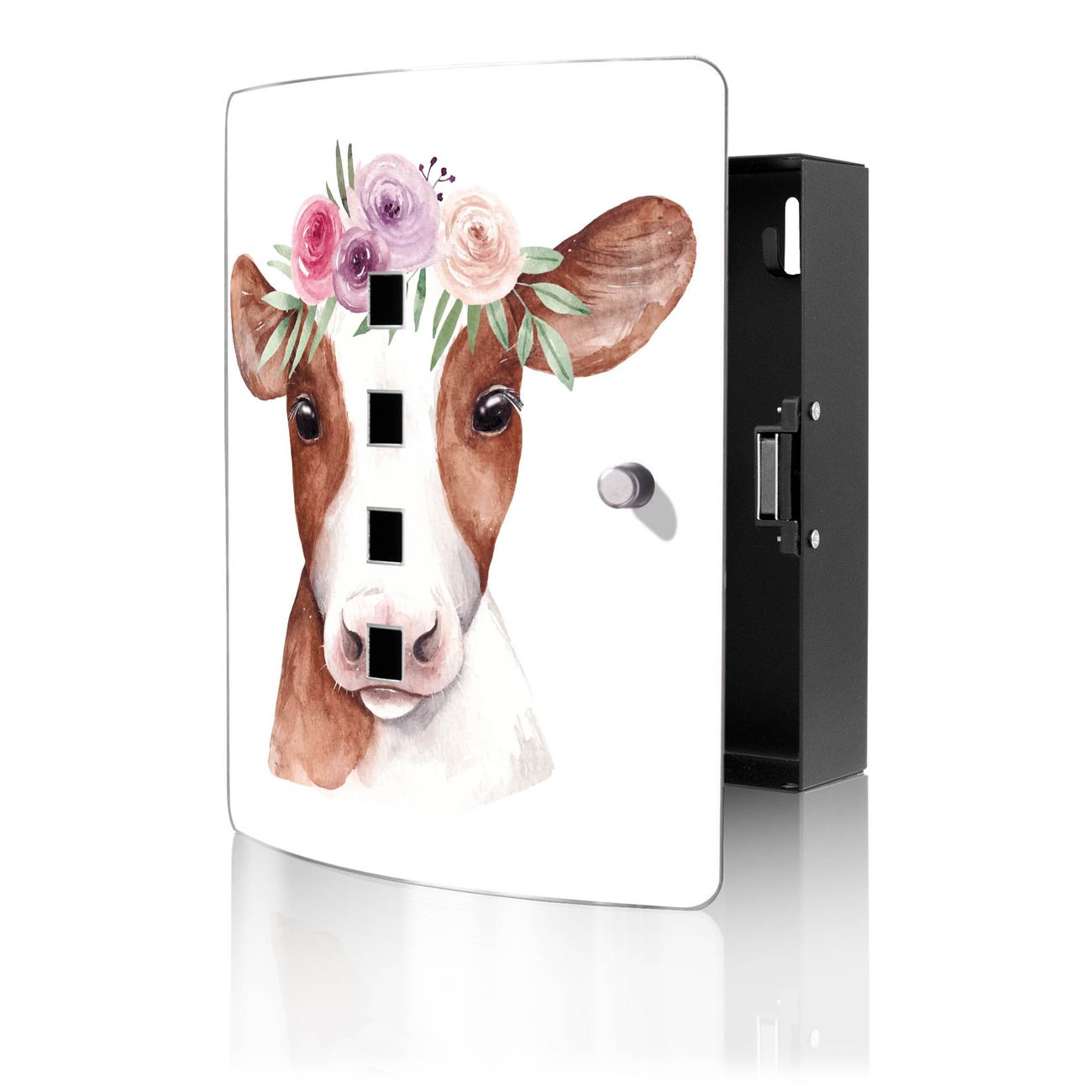 Funktion / Nutzen: Die leicht geschwungene Edelstahltür ist mit einer hochwertigen Motivfolie und dem Motiv Motiv Kuh mit Blumenkrone kaschiert. Ein praktischer Magnetverschluss ermöglicht Ihnen ein schnelles Öffnen und Schließen. Befestigt wird der Schlüsselkasten an 2 Stellen auf der Rückseite, passendes Montagematerial fügen wir bereits bei.