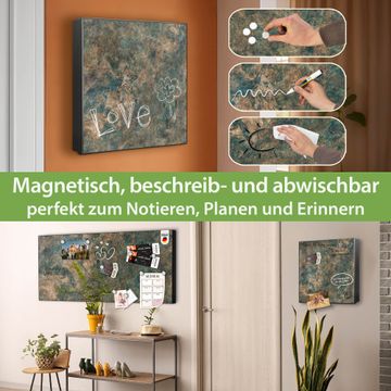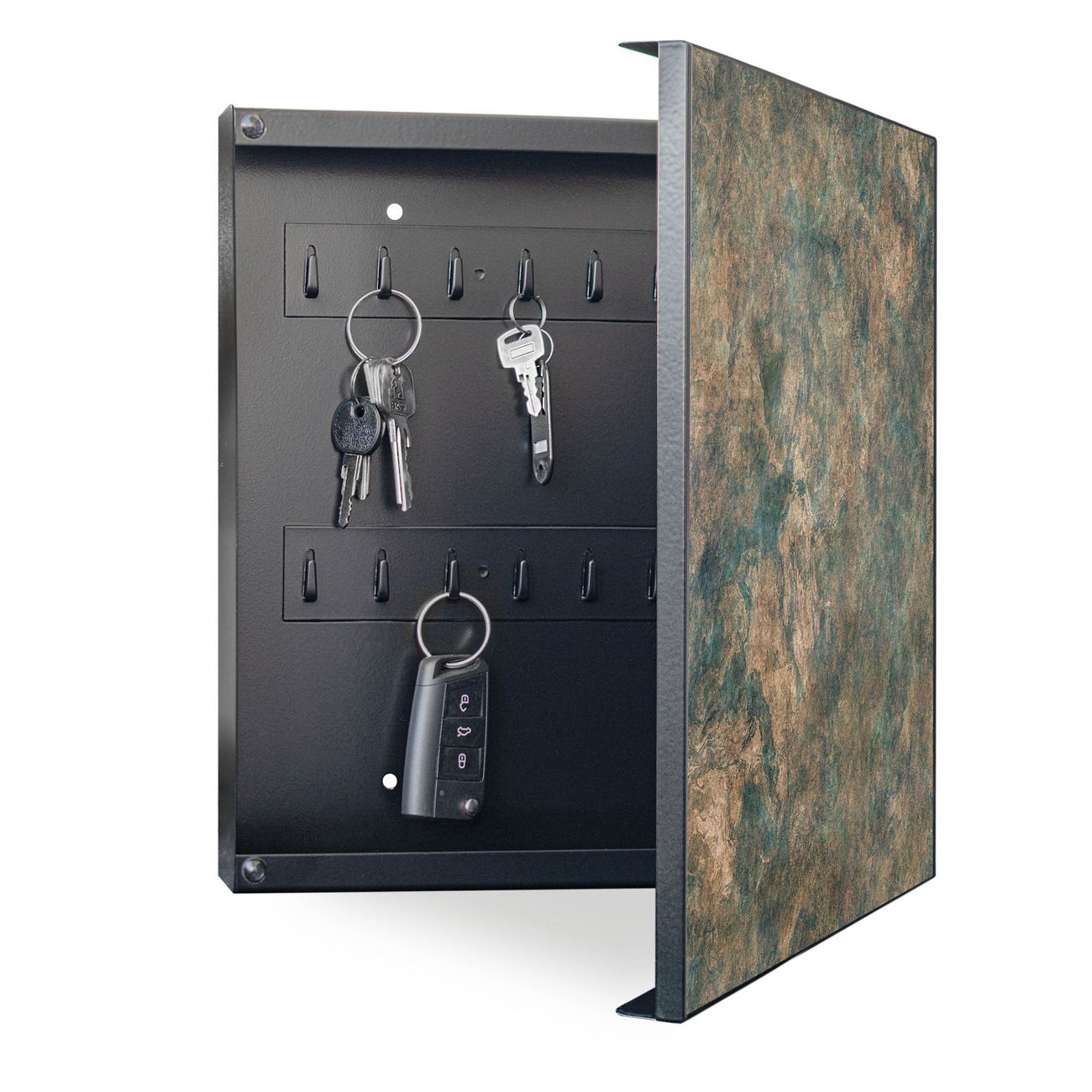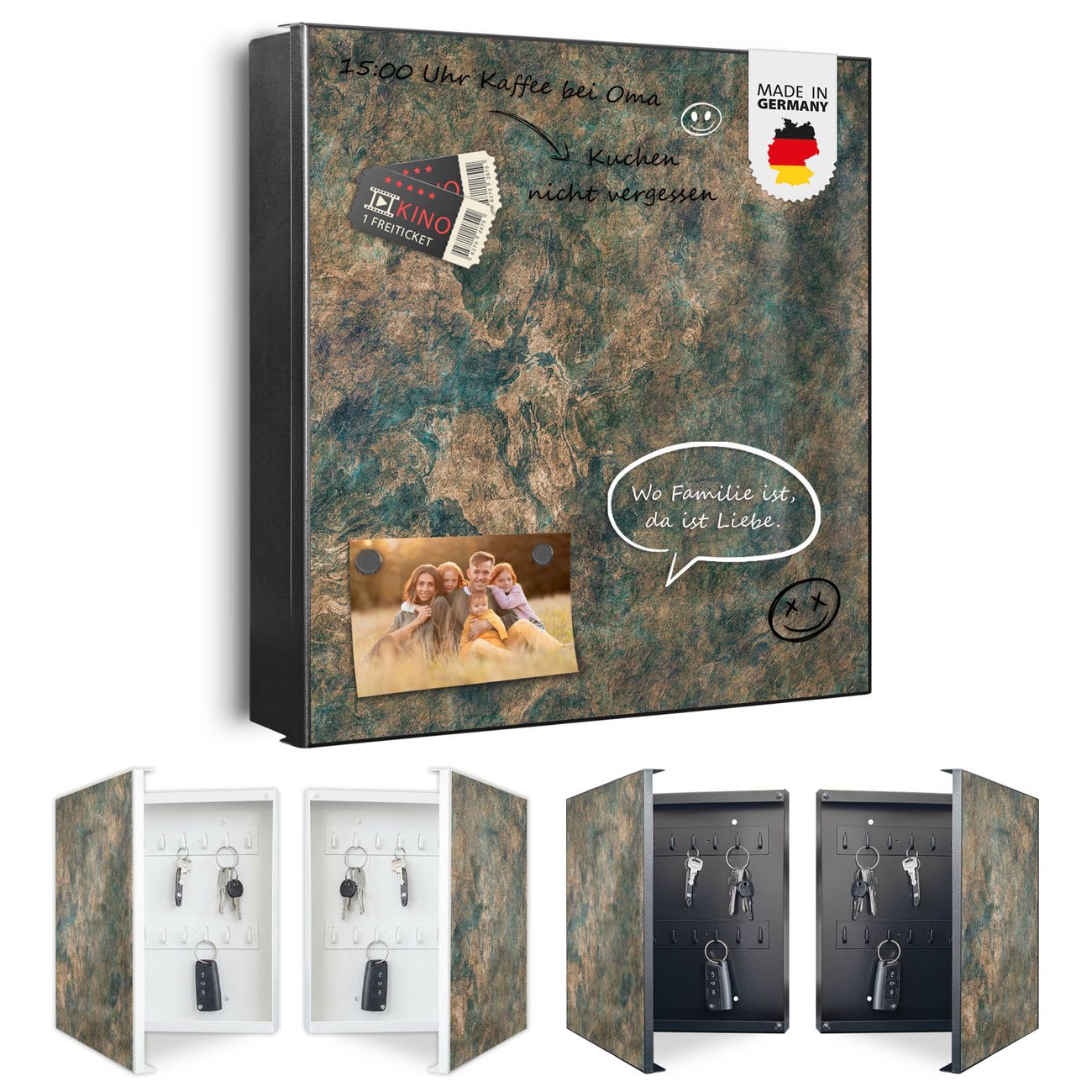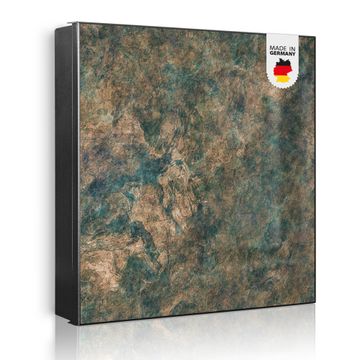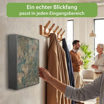 Bringe Ordnung und Eleganz in deinen Eingangsbereich mit dem banjado Schlüsselkasten Motiv Motiv Kupfer Patina. Die moderne Schlüsselbox kombiniert funktionales Design mit hochwertiger Verarbeitung und wird so zu einem echten Hingucker in Flur, Büro oder Ferienwohnung. ✅ Stilvolle Schlüsselaufbewahrung mit Motiv Motiv Kupfer Patina Der Design-Schlüsselkasten Motiv Motiv Kupfer Patina bietet Platz für bis zu 32 Schlüssel, die auf 4 stabilen Reihen mit je 8 Haken übersichtlich verstaut werden. Mit seinen kompakten Maßen von 30 x 30 x 5 cm passt die Schlüsselbox perfekt auch in kleinere Räume. Der schwarz lackierte Stahlkorpus mit rechts angeschlagenem Türscharnier harmoniert mit gedruckten Folie auf der Front und fügt sich nahtlos in jedes Wohnambiente ein. Ob als Schlüsselorganizer für Zuhause oder als praktische Lösung für Büros, Praxen und Gewerbe, der banjado Schlüsselkasten sorgt für Ordnung und Übersicht. Dank der magnetischen, mit Kreidestiften beschreibbaren Folie auf der Front kannst du Notizen anheften oder Termine direkt auf der Oberfläche festhalten. Die Schlüsselbox Motiv Motiv Kupfer Patina zur Wandmontage wird inklusive Befestigungsmaterial geliefert und ist schnell angebracht. So hast du deine Schlüssel jederzeit griffbereit und zugleich stilvoll verstaut. Mit diesem banjado Schlüsselkasten Motiv Motiv Kupfer Patina kombinierst du praktische Aufbewahrung mit stilvollem Wohndesign. Ob privat oder geschäftlich, die Schlüsselbox sorgt für mehr Ordnung, Übersicht und ein wohnliches Ambiente.Vorteile im Überblick