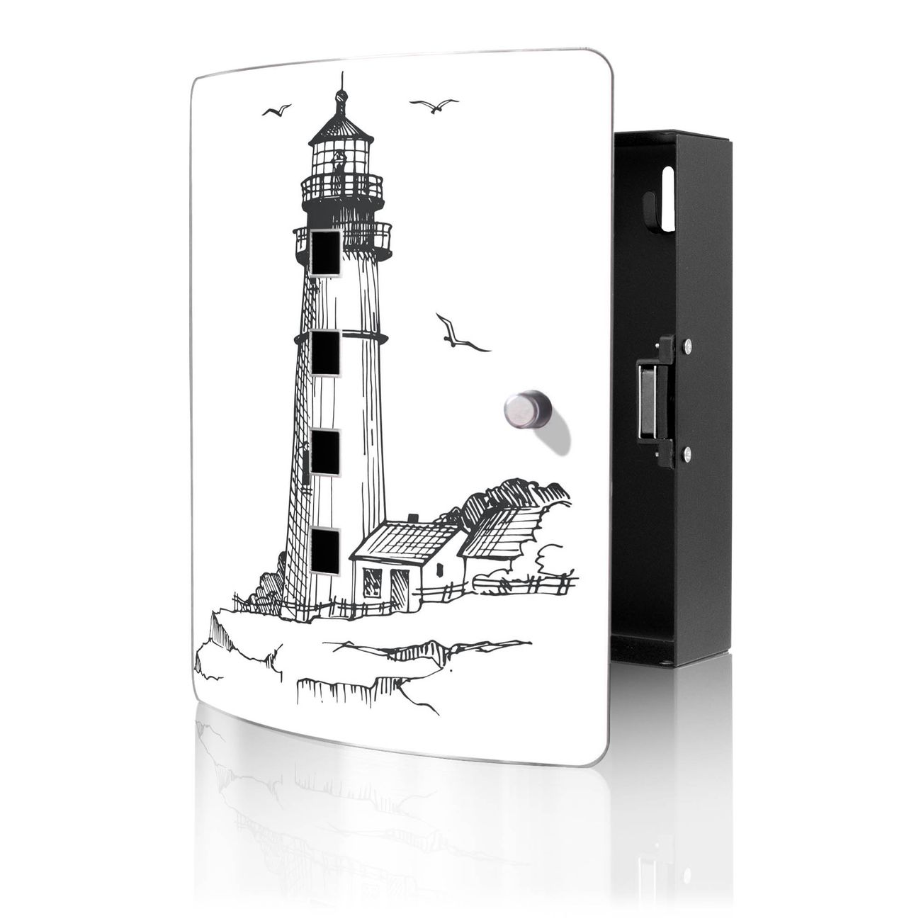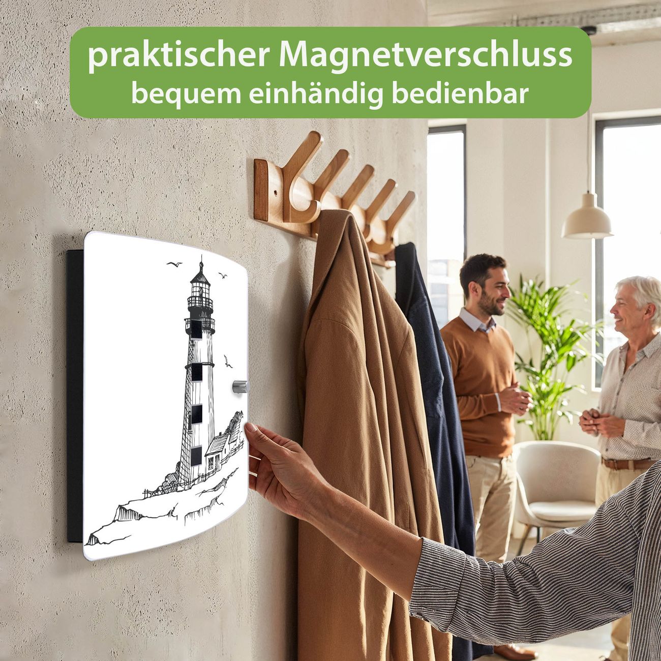 Funktion / Nutzen: Die leicht geschwungene Edelstahltür ist mit einer hochwertigen Motivfolie und dem Motiv Motiv Leuchtturm 9 kaschiert. Ein praktischer Magnetverschluss ermöglicht Ihnen ein schnelles Öffnen und Schließen. Befestigt wird der Schlüsselkasten an 2 Stellen auf der Rückseite, passendes Montagematerial fügen wir bereits bei.