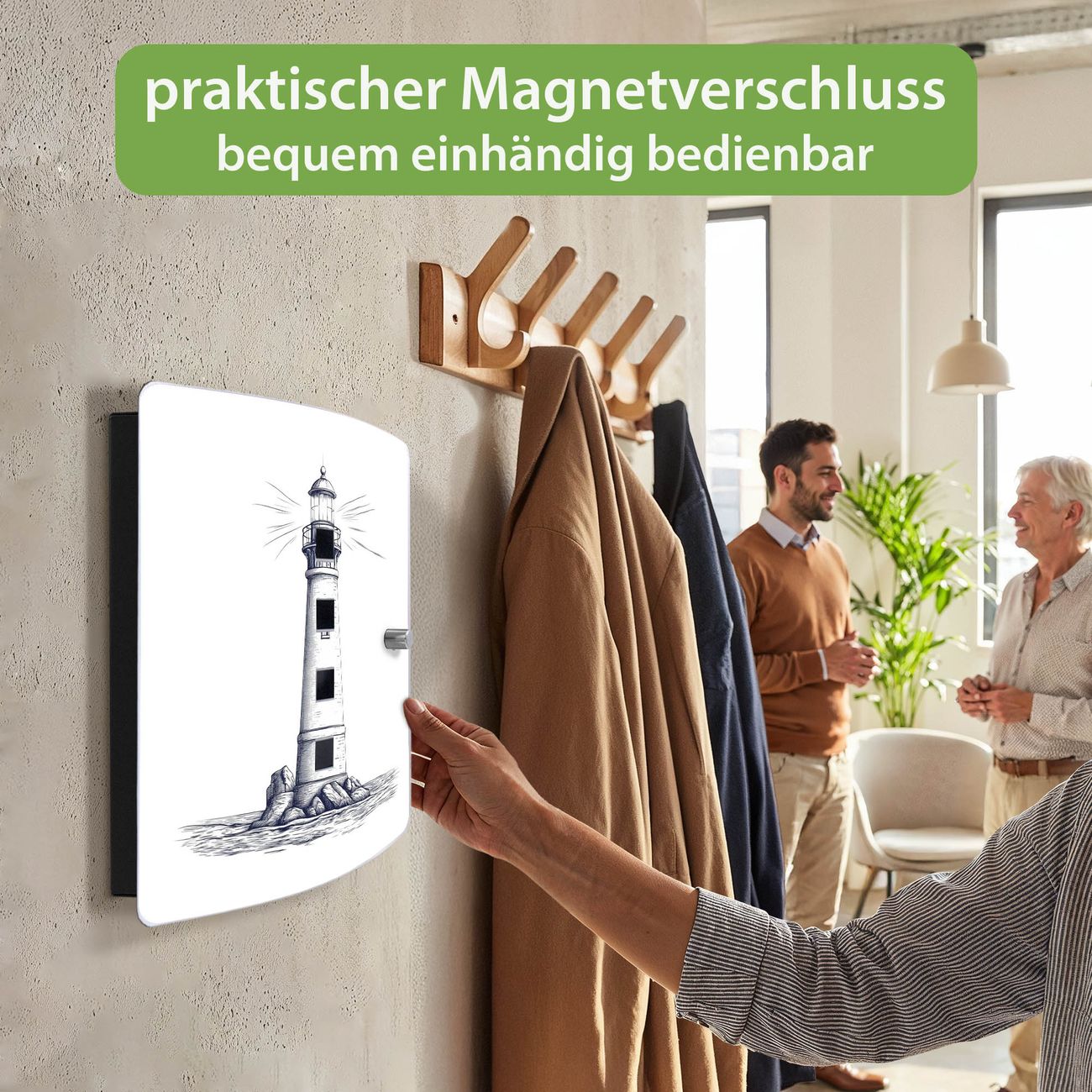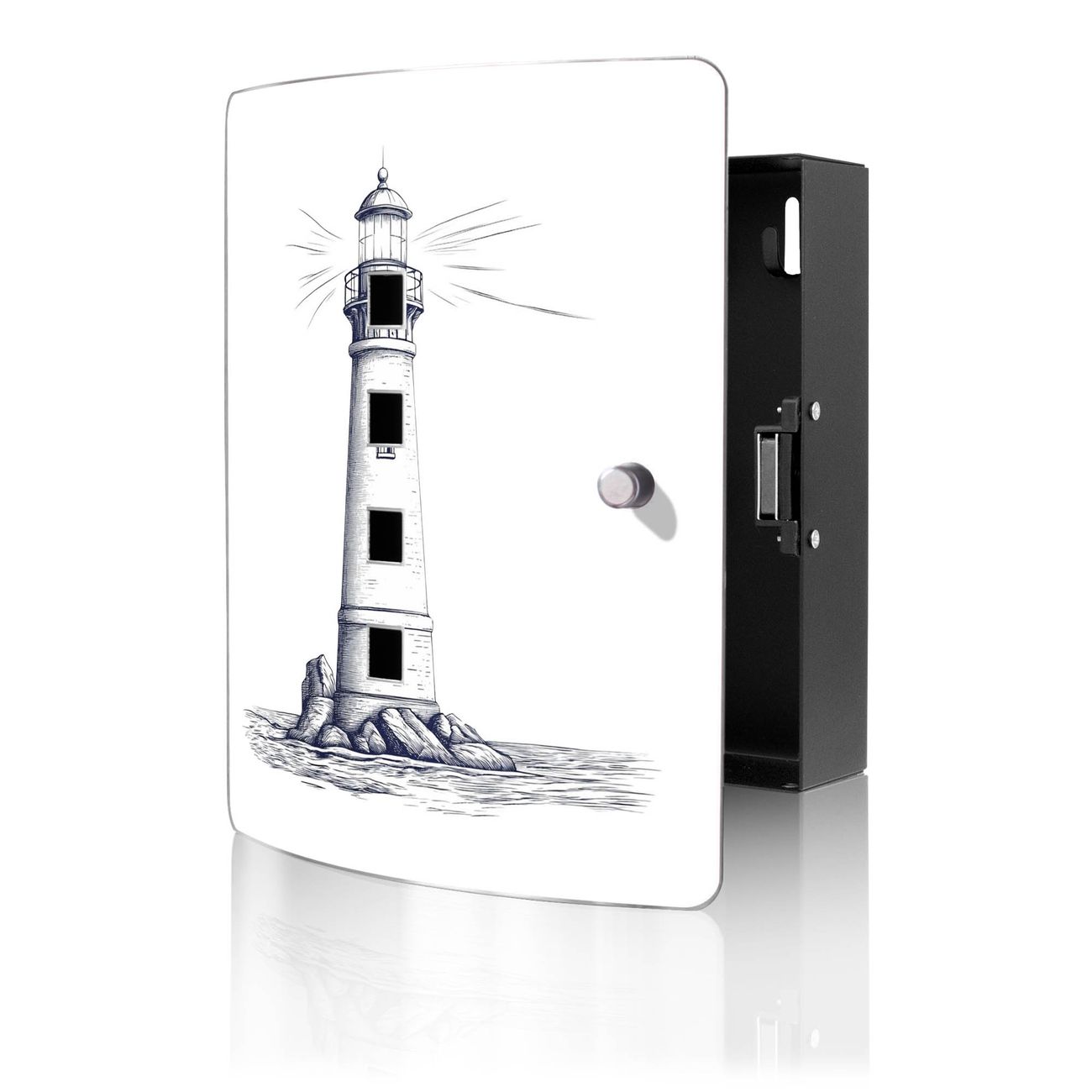 Funktion / Nutzen: Die leicht geschwungene Edelstahltür ist mit einer hochwertigen Motivfolie und dem Motiv Motiv Leuchtturm-Skizze kaschiert. Ein praktischer Magnetverschluss ermöglicht Ihnen ein schnelles Öffnen und Schließen. Befestigt wird der Schlüsselkasten an 2 Stellen auf der Rückseite, passendes Montagematerial fügen wir bereits bei.