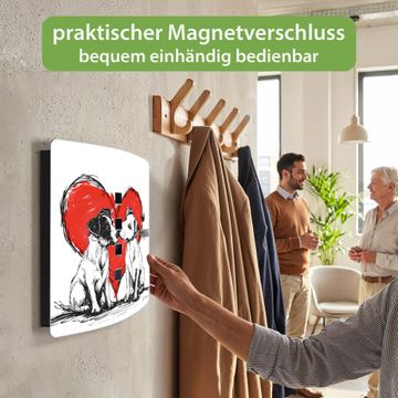 Funktion / Nutzen: Die leicht geschwungene Edelstahltür ist mit einer hochwertigen Motivfolie und dem Motiv Motiv Liebende Hunde kaschiert. Ein praktischer Magnetverschluss ermöglicht Ihnen ein schnelles Öffnen und Schließen. Befestigt wird der Schlüsselkasten an 2 Stellen auf der Rückseite, passendes Montagematerial fügen wir bereits bei.