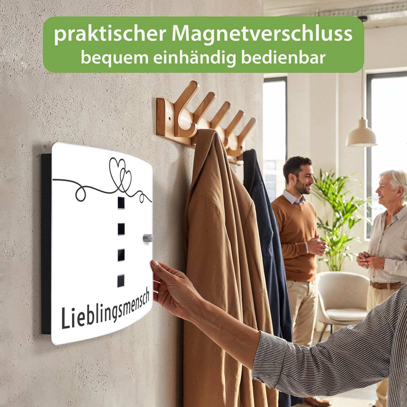 Funktion / Nutzen: Die leicht geschwungene Edelstahltür ist mit einer hochwertigen Motivfolie und dem Motiv Motiv Lieblingsmensch Herz Lineart 2 kaschiert. Ein praktischer Magnetverschluss ermöglicht Ihnen ein schnelles Öffnen und Schließen. Befestigt wird der Schlüsselkasten an 2 Stellen auf der Rückseite, passendes Montagematerial fügen wir bereits bei.