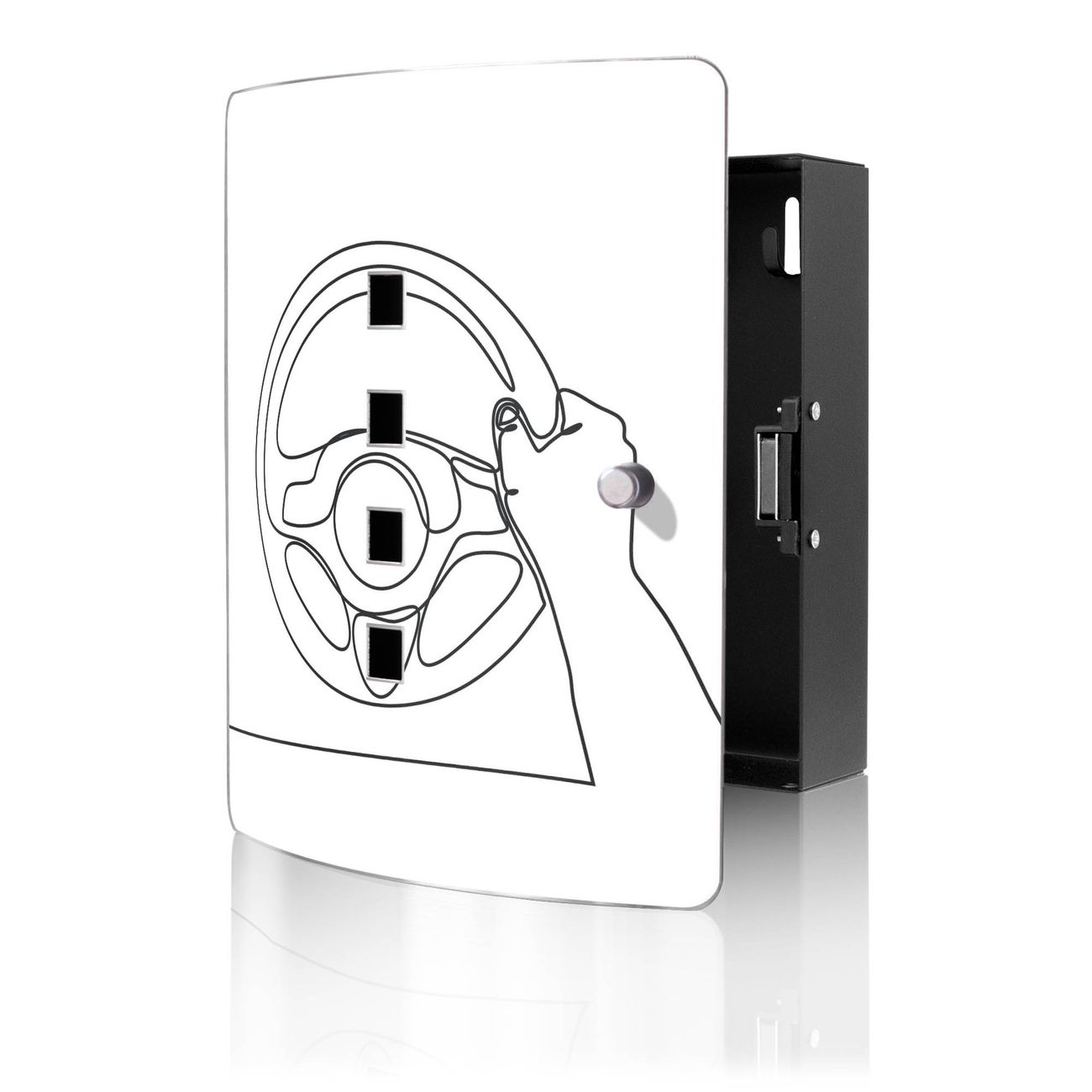 Funktion / Nutzen: Die leicht geschwungene Edelstahltür ist mit einer hochwertigen Motivfolie und dem Motiv Motiv Lineart Lenkrad kaschiert. Ein praktischer Magnetverschluss ermöglicht Ihnen ein schnelles Öffnen und Schließen. Befestigt wird der Schlüsselkasten an 2 Stellen auf der Rückseite, passendes Montagematerial fügen wir bereits bei.