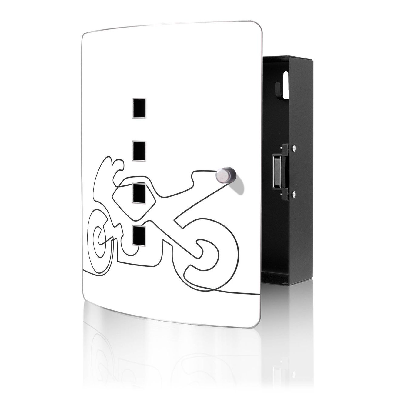 Funktion / Nutzen: Die leicht geschwungene Edelstahltür ist mit einer hochwertigen Motivfolie und dem Motiv Motiv Lineart Motorrad kaschiert. Ein praktischer Magnetverschluss ermöglicht Ihnen ein schnelles Öffnen und Schließen. Befestigt wird der Schlüsselkasten an 2 Stellen auf der Rückseite, passendes Montagematerial fügen wir bereits bei.
