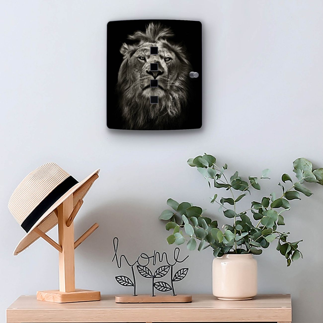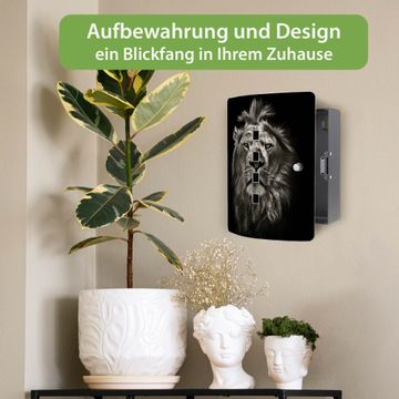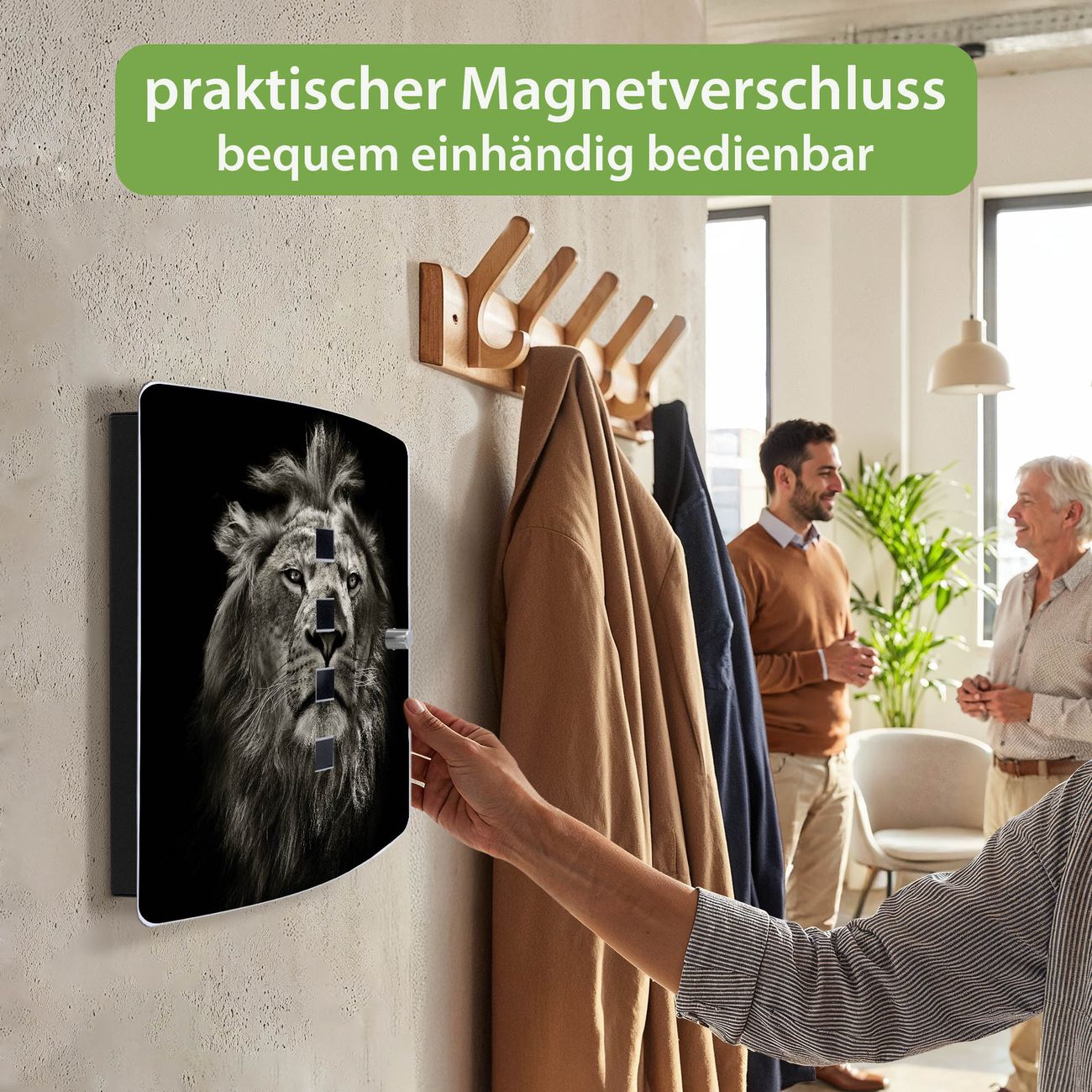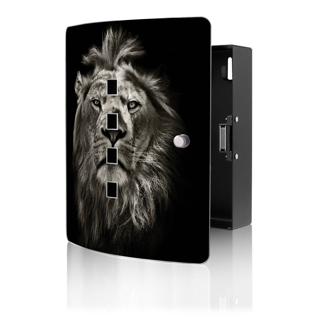 Funktion / Nutzen: Die leicht geschwungene Edelstahltür ist mit einer hochwertigen Motivfolie und dem Motiv Motiv Löwe Porträt kaschiert. Ein praktischer Magnetverschluss ermöglicht Ihnen ein schnelles Öffnen und Schließen. Befestigt wird der Schlüsselkasten an 2 Stellen auf der Rückseite, passendes Montagematerial fügen wir bereits bei.
