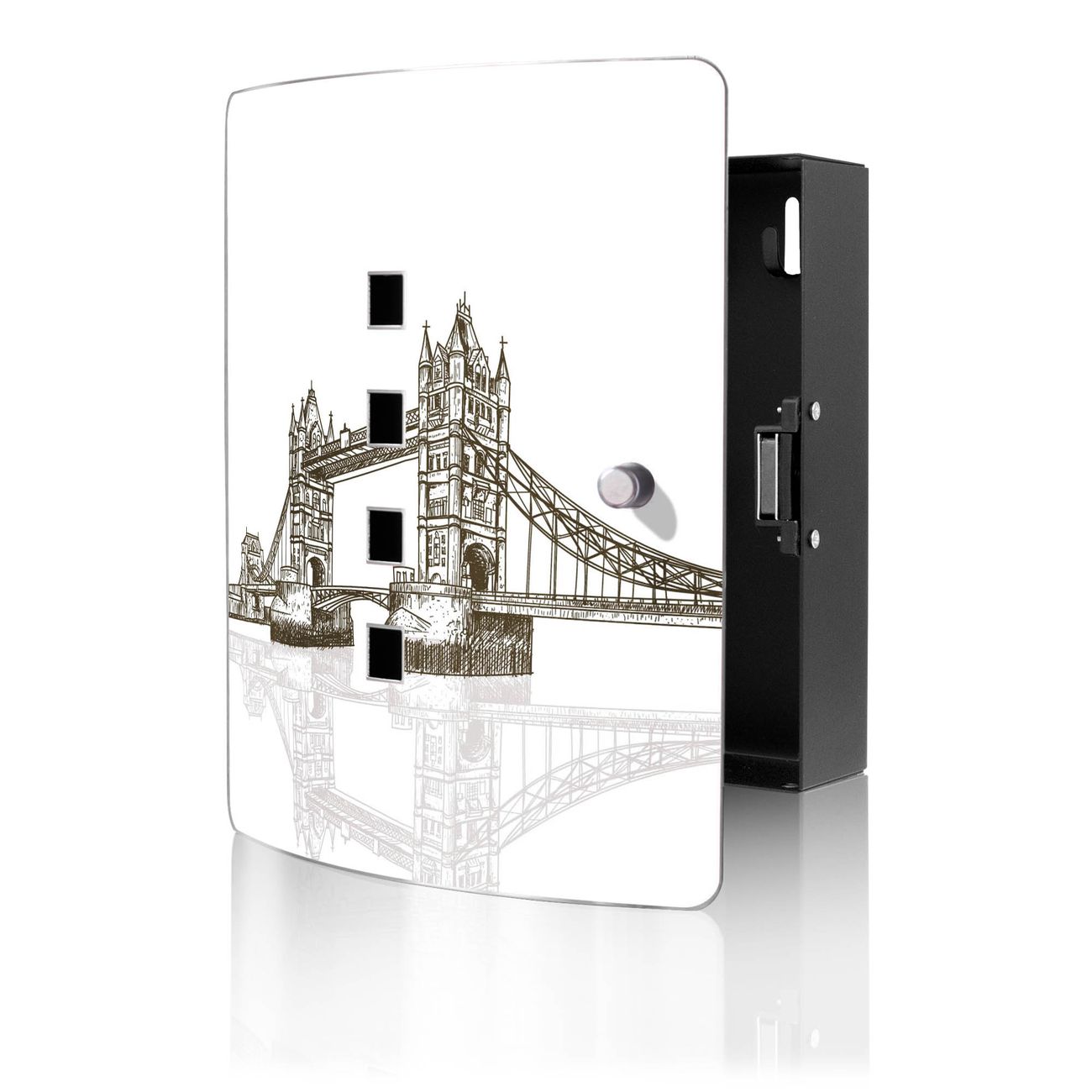 Funktion / Nutzen: Die leicht geschwungene Edelstahltür ist mit einer hochwertigen Motivfolie und dem Motiv Motiv London Brücke Skizze kaschiert. Ein praktischer Magnetverschluss ermöglicht Ihnen ein schnelles Öffnen und Schließen. Befestigt wird der Schlüsselkasten an 2 Stellen auf der Rückseite, passendes Montagematerial fügen wir bereits bei.