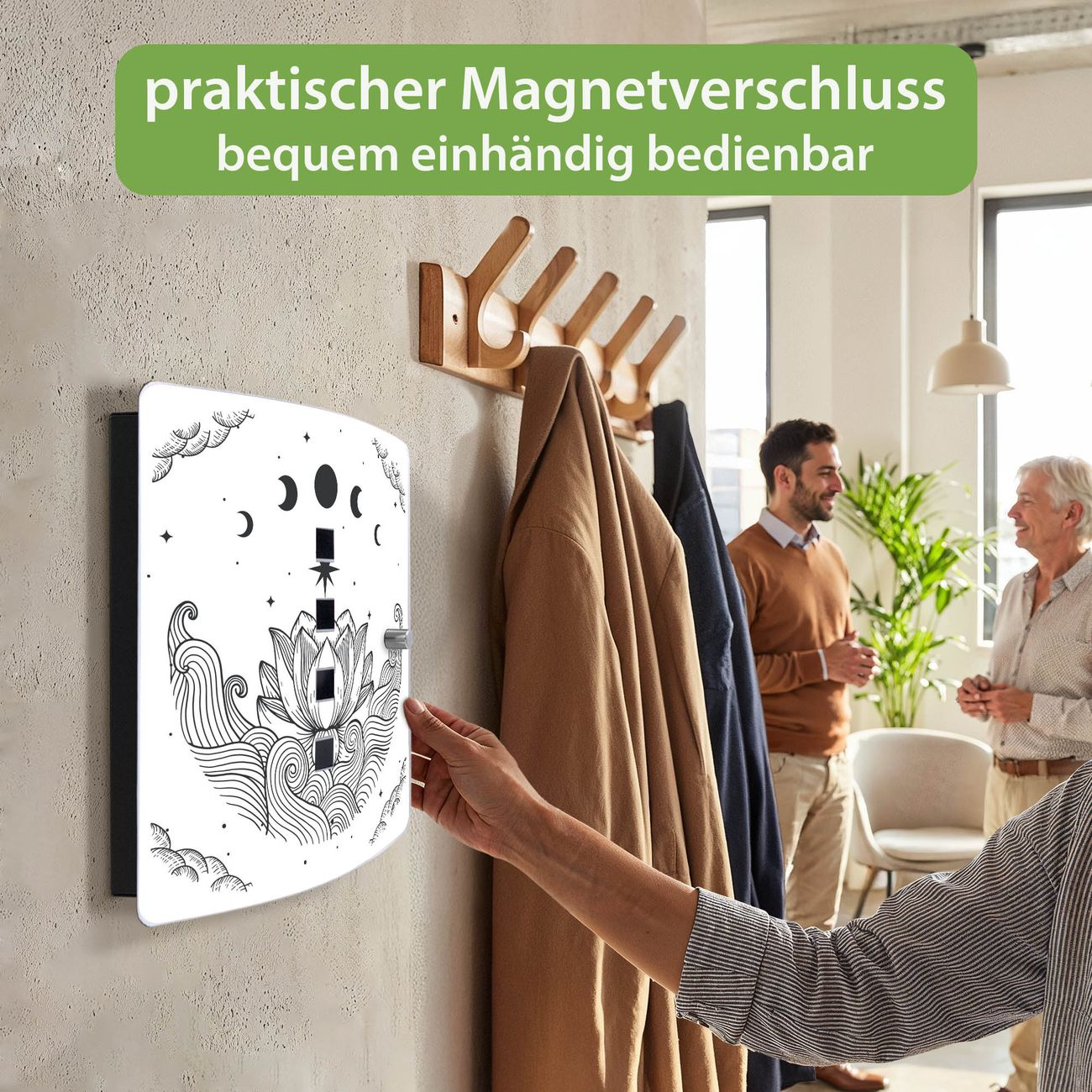 Funktion / Nutzen: Die leicht geschwungene Edelstahltür ist mit einer hochwertigen Motivfolie und dem Motiv Motiv Lotus und Mondphasen 2 kaschiert. Ein praktischer Magnetverschluss ermöglicht Ihnen ein schnelles Öffnen und Schließen. Befestigt wird der Schlüsselkasten an 2 Stellen auf der Rückseite, passendes Montagematerial fügen wir bereits bei.