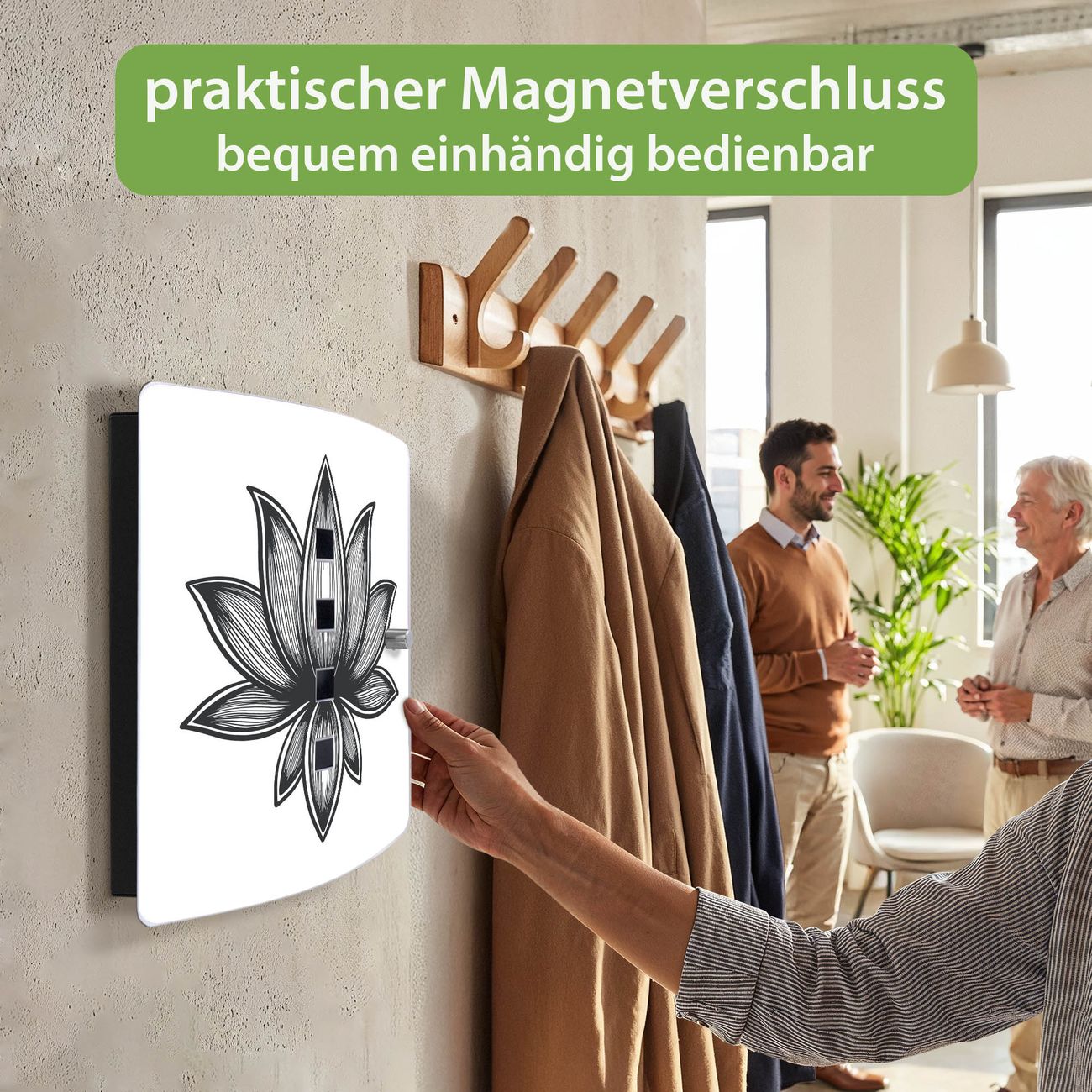 Funktion / Nutzen: Die leicht geschwungene Edelstahltür ist mit einer hochwertigen Motivfolie und dem Motiv Motiv Lotusblüte 10 kaschiert. Ein praktischer Magnetverschluss ermöglicht Ihnen ein schnelles Öffnen und Schließen. Befestigt wird der Schlüsselkasten an 2 Stellen auf der Rückseite, passendes Montagematerial fügen wir bereits bei.