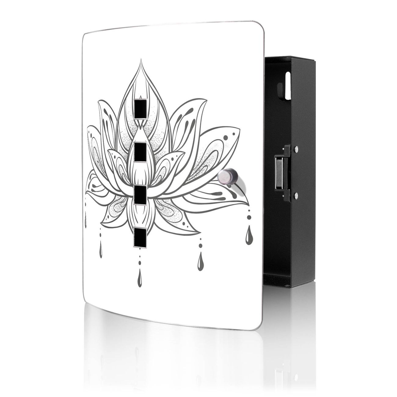 Funktion / Nutzen: Die leicht geschwungene Edelstahltür ist mit einer hochwertigen Motivfolie und dem Motiv Motiv Lotusblüte 6 kaschiert. Ein praktischer Magnetverschluss ermöglicht Ihnen ein schnelles Öffnen und Schließen. Befestigt wird der Schlüsselkasten an 2 Stellen auf der Rückseite, passendes Montagematerial fügen wir bereits bei.
