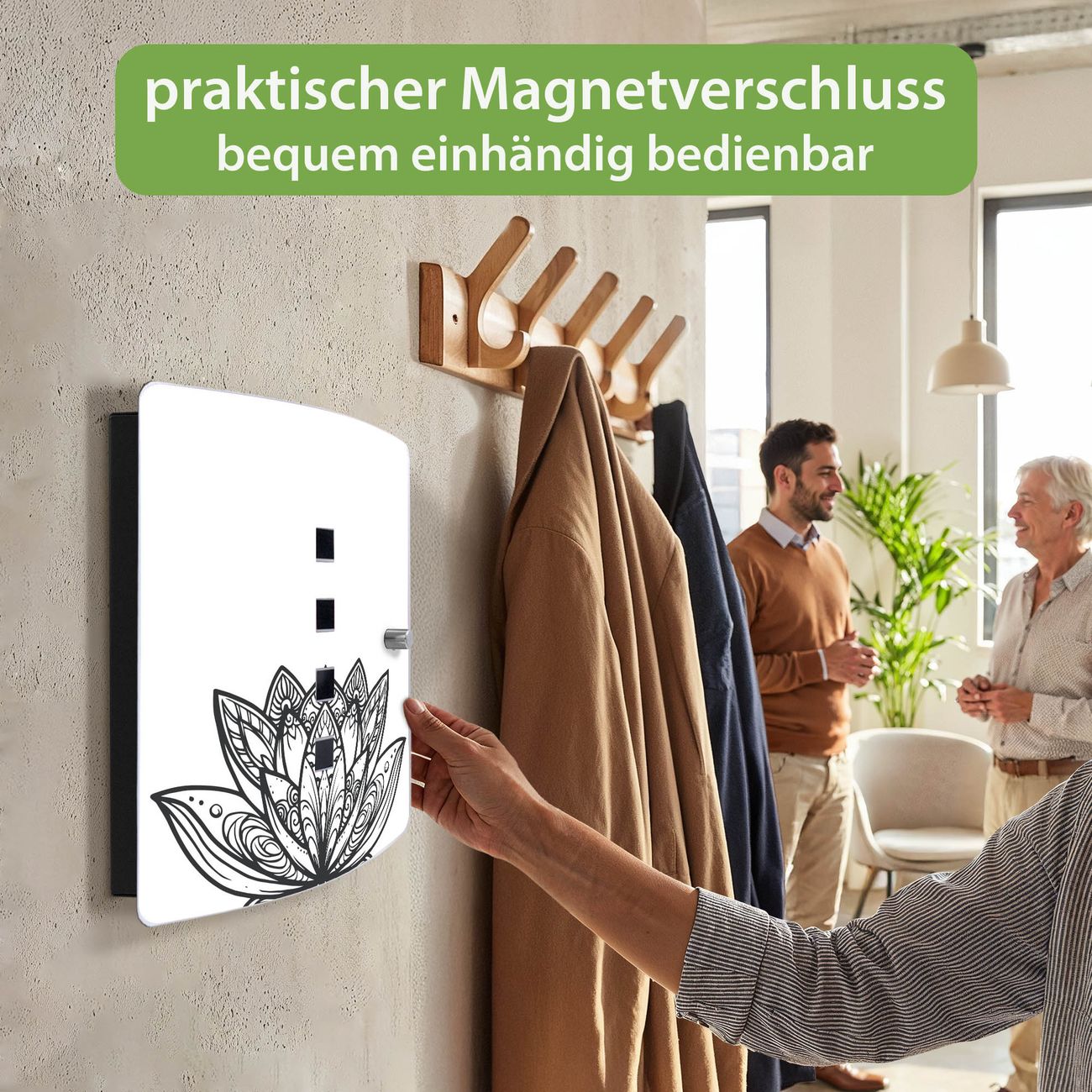 Funktion / Nutzen: Die leicht geschwungene Edelstahltür ist mit einer hochwertigen Motivfolie und dem Motiv Motiv Lotusblüte 8 kaschiert. Ein praktischer Magnetverschluss ermöglicht Ihnen ein schnelles Öffnen und Schließen. Befestigt wird der Schlüsselkasten an 2 Stellen auf der Rückseite, passendes Montagematerial fügen wir bereits bei.