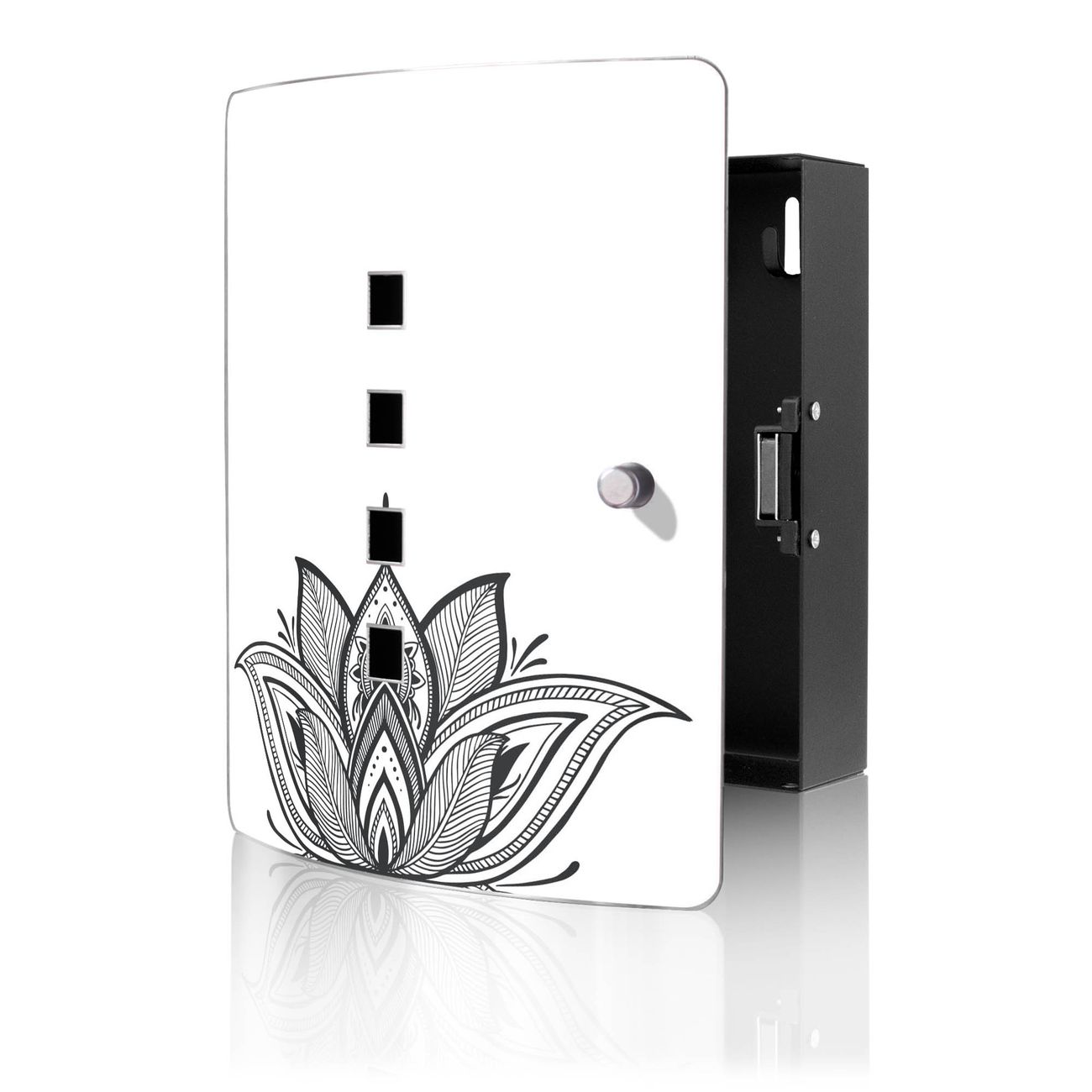 Funktion / Nutzen: Die leicht geschwungene Edelstahltür ist mit einer hochwertigen Motivfolie und dem Motiv Motiv Lotusblüte 9 kaschiert. Ein praktischer Magnetverschluss ermöglicht Ihnen ein schnelles Öffnen und Schließen. Befestigt wird der Schlüsselkasten an 2 Stellen auf der Rückseite, passendes Montagematerial fügen wir bereits bei.