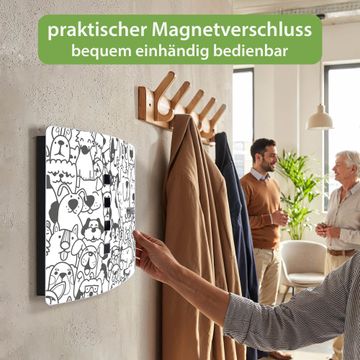 Funktion / Nutzen: Die leicht geschwungene Edelstahltür ist mit einer hochwertigen Motivfolie und dem Motiv Motiv Lustiges Hundemuster kaschiert. Ein praktischer Magnetverschluss ermöglicht Ihnen ein schnelles Öffnen und Schließen. Befestigt wird der Schlüsselkasten an 2 Stellen auf der Rückseite, passendes Montagematerial fügen wir bereits bei.