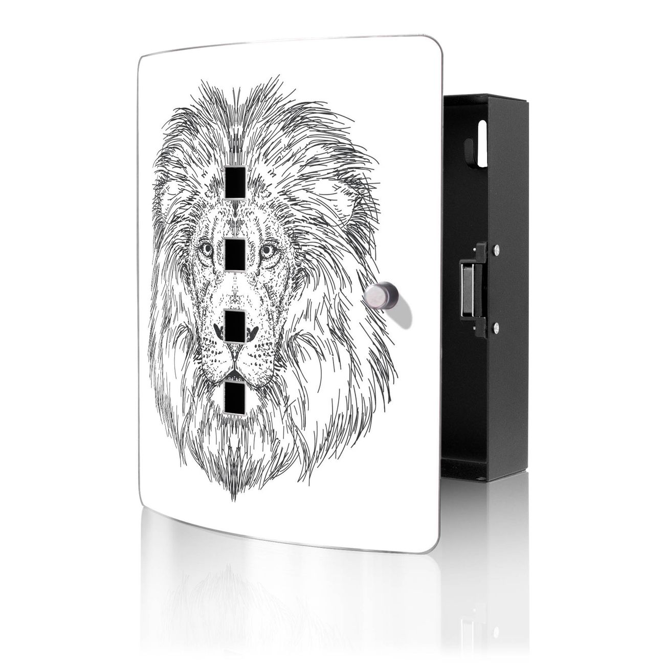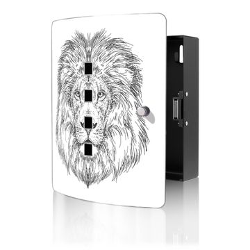 Funktion / Nutzen: Die leicht geschwungene Edelstahltür ist mit einer hochwertigen Motivfolie und dem Motiv Motiv Majestätischer Löwe kaschiert. Ein praktischer Magnetverschluss ermöglicht Ihnen ein schnelles Öffnen und Schließen. Befestigt wird der Schlüsselkasten an 2 Stellen auf der Rückseite, passendes Montagematerial fügen wir bereits bei.