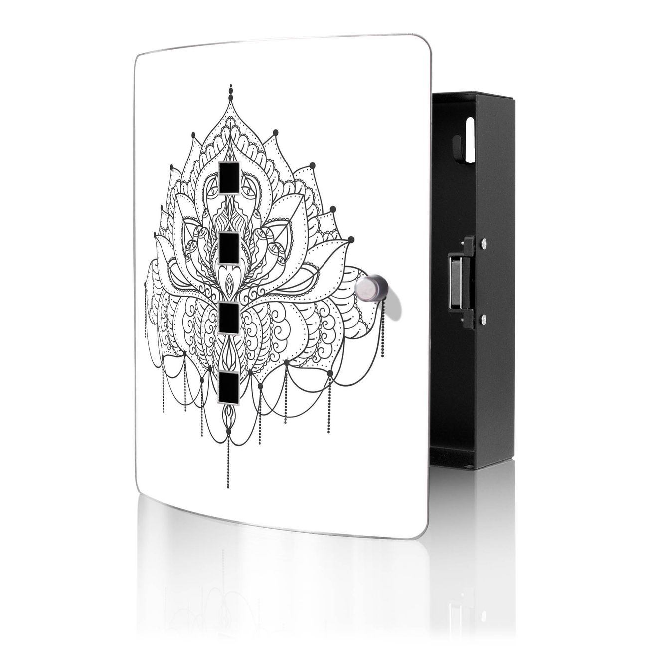 Funktion / Nutzen: Die leicht geschwungene Edelstahltür ist mit einer hochwertigen Motivfolie und dem Motiv Motiv Mandala Muster kaschiert. Ein praktischer Magnetverschluss ermöglicht Ihnen ein schnelles Öffnen und Schließen. Befestigt wird der Schlüsselkasten an 2 Stellen auf der Rückseite, passendes Montagematerial fügen wir bereits bei.