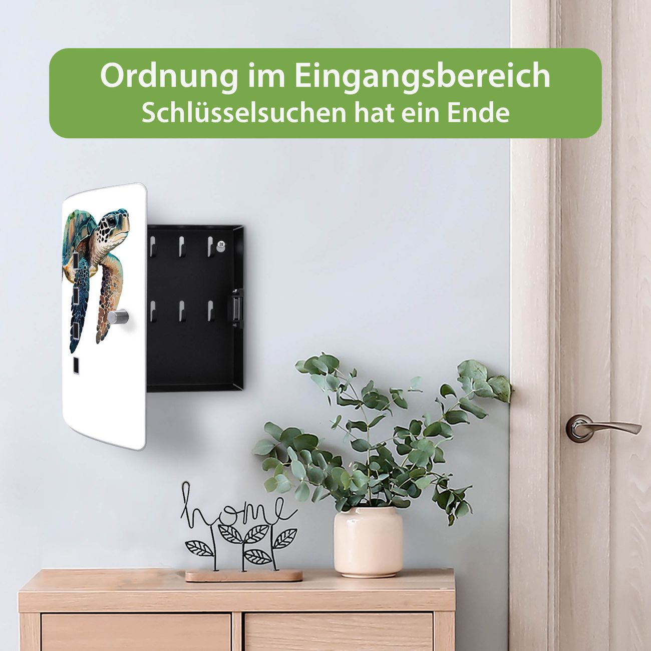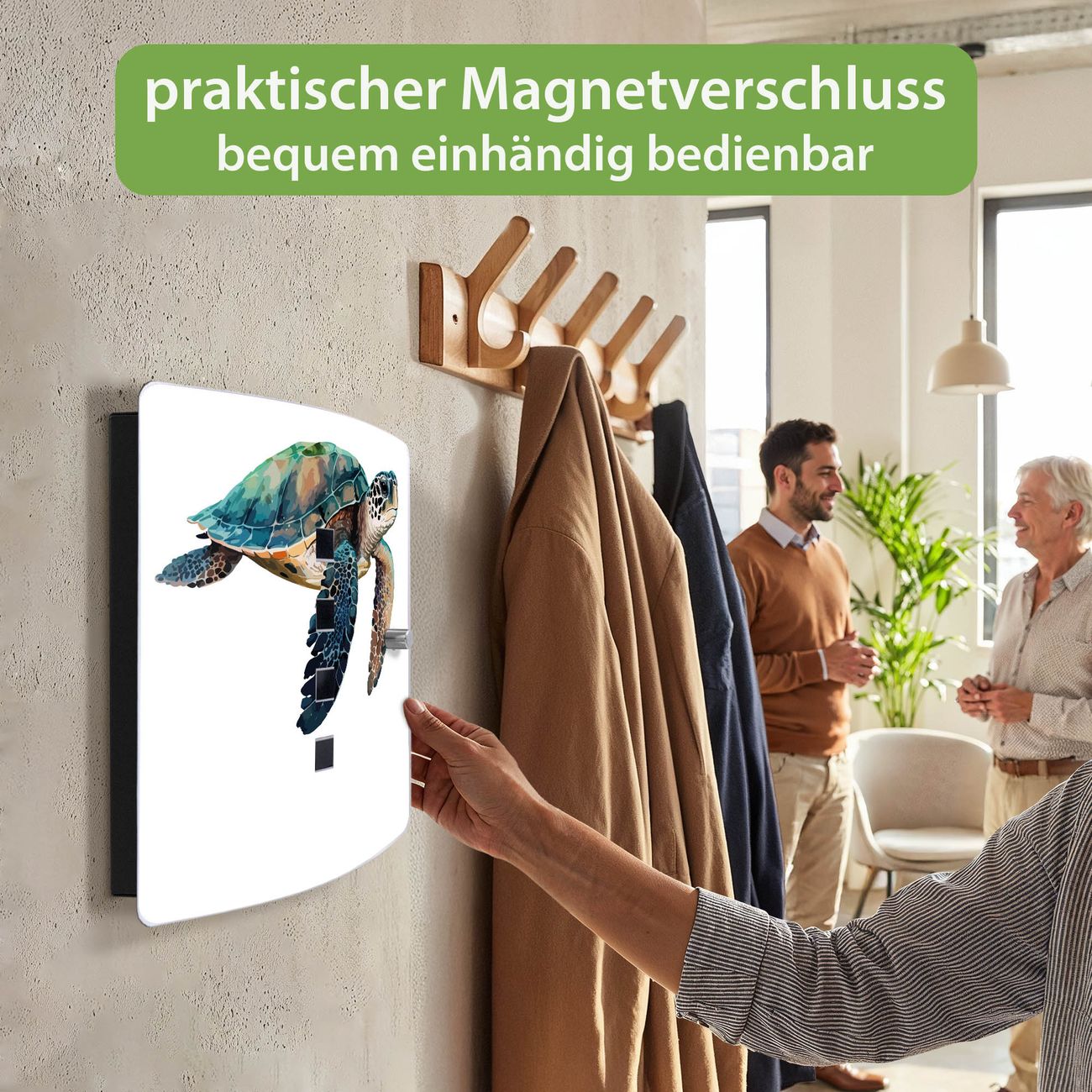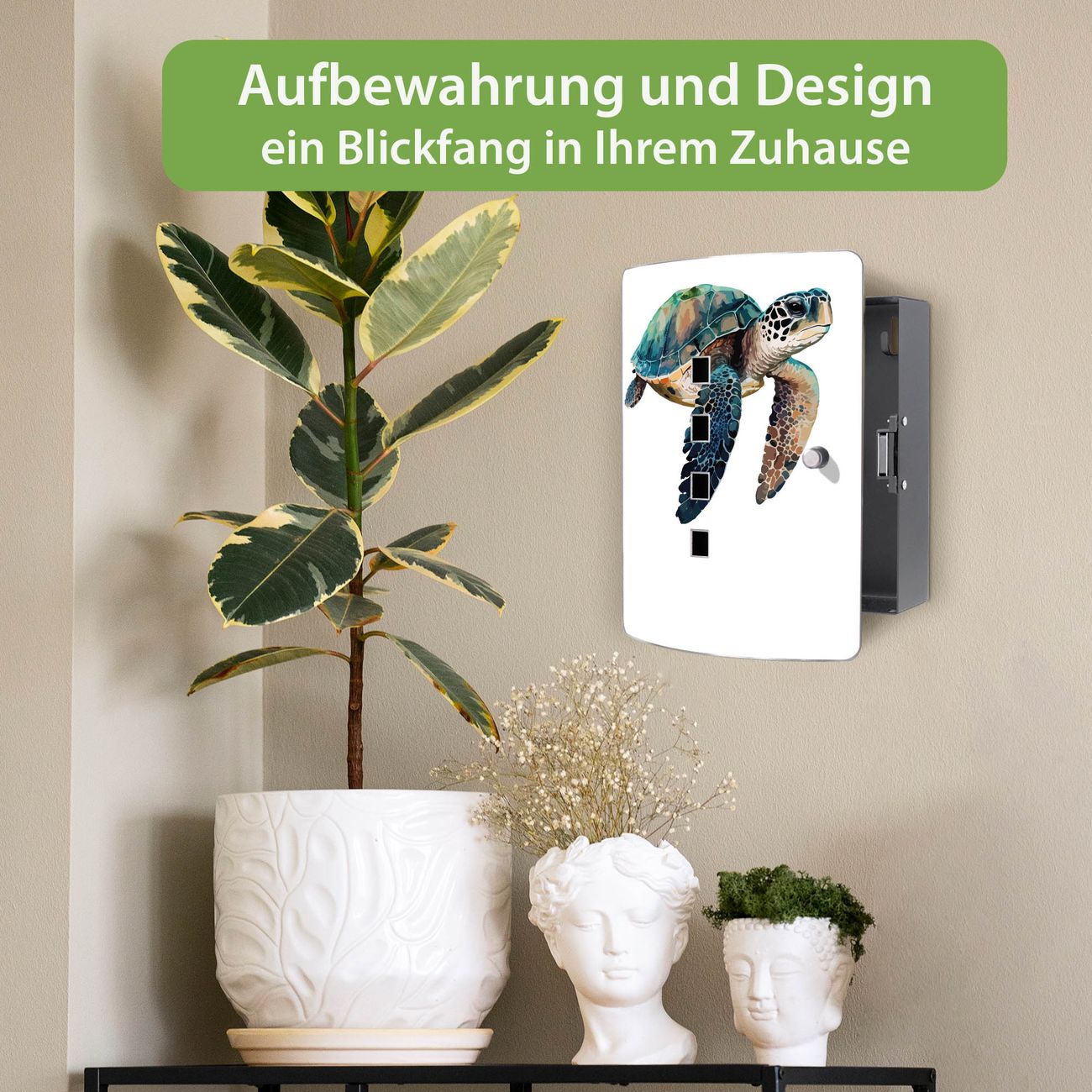 Funktion / Nutzen: Die leicht geschwungene Edelstahltür ist mit einer hochwertigen Motivfolie und dem Motiv Motiv Meeresschildkröte Aquarell kaschiert. Ein praktischer Magnetverschluss ermöglicht Ihnen ein schnelles Öffnen und Schließen. Befestigt wird der Schlüsselkasten an 2 Stellen auf der Rückseite, passendes Montagematerial fügen wir bereits bei.