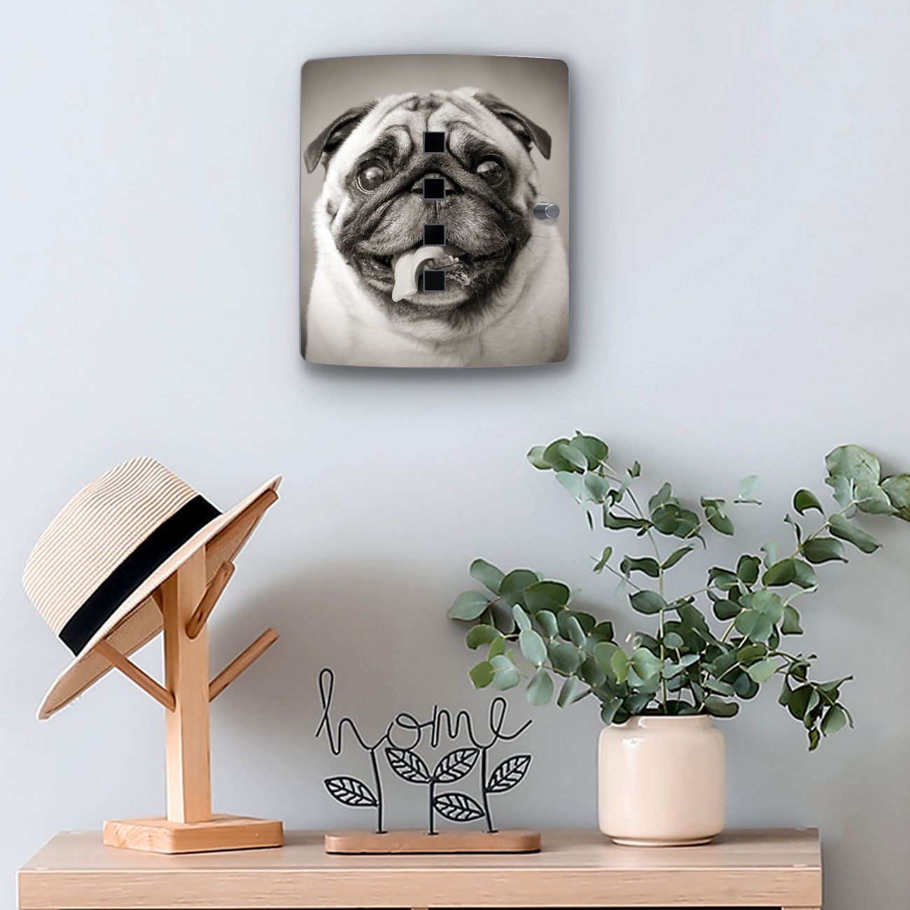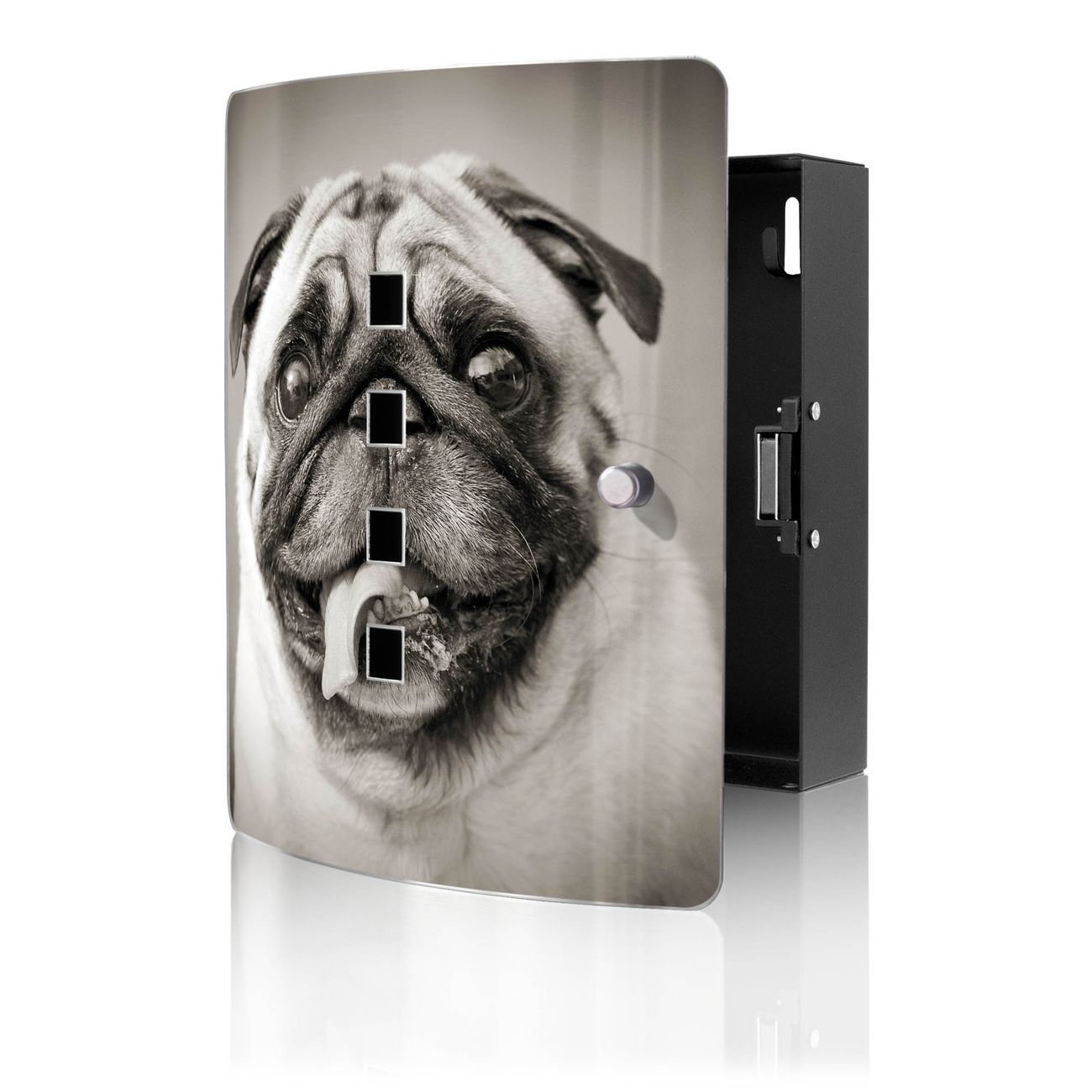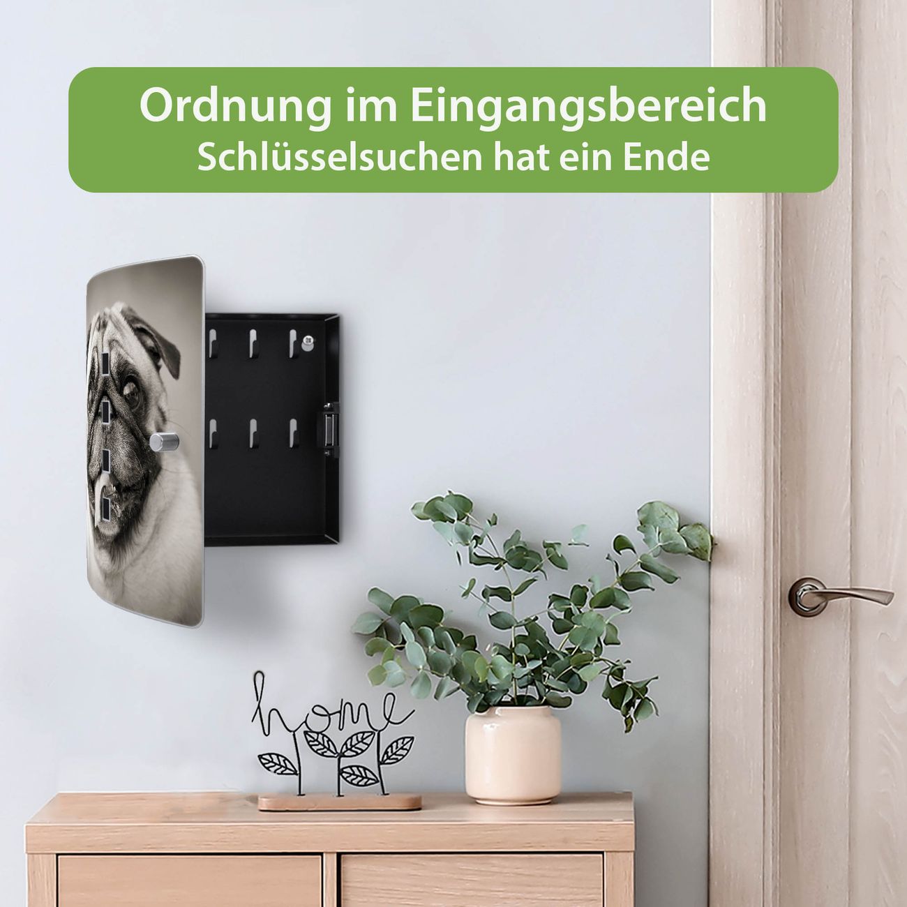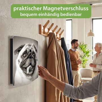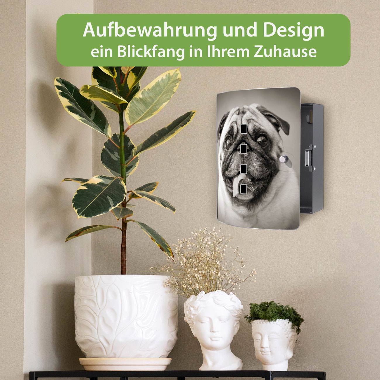 Funktion / Nutzen: Die leicht geschwungene Edelstahltür ist mit einer hochwertigen Motivfolie und dem Motiv Motiv Mops Porträt kaschiert. Ein praktischer Magnetverschluss ermöglicht Ihnen ein schnelles Öffnen und Schließen. Befestigt wird der Schlüsselkasten an 2 Stellen auf der Rückseite, passendes Montagematerial fügen wir bereits bei.