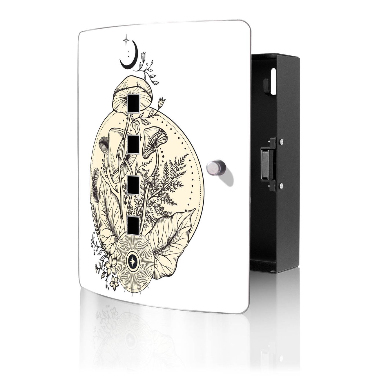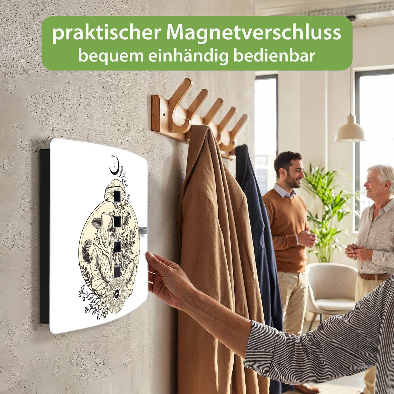 Funktion / Nutzen: Die leicht geschwungene Edelstahltür ist mit einer hochwertigen Motivfolie und dem Motiv Motiv Mystische Natur kaschiert. Ein praktischer Magnetverschluss ermöglicht Ihnen ein schnelles Öffnen und Schließen. Befestigt wird der Schlüsselkasten an 2 Stellen auf der Rückseite, passendes Montagematerial fügen wir bereits bei.