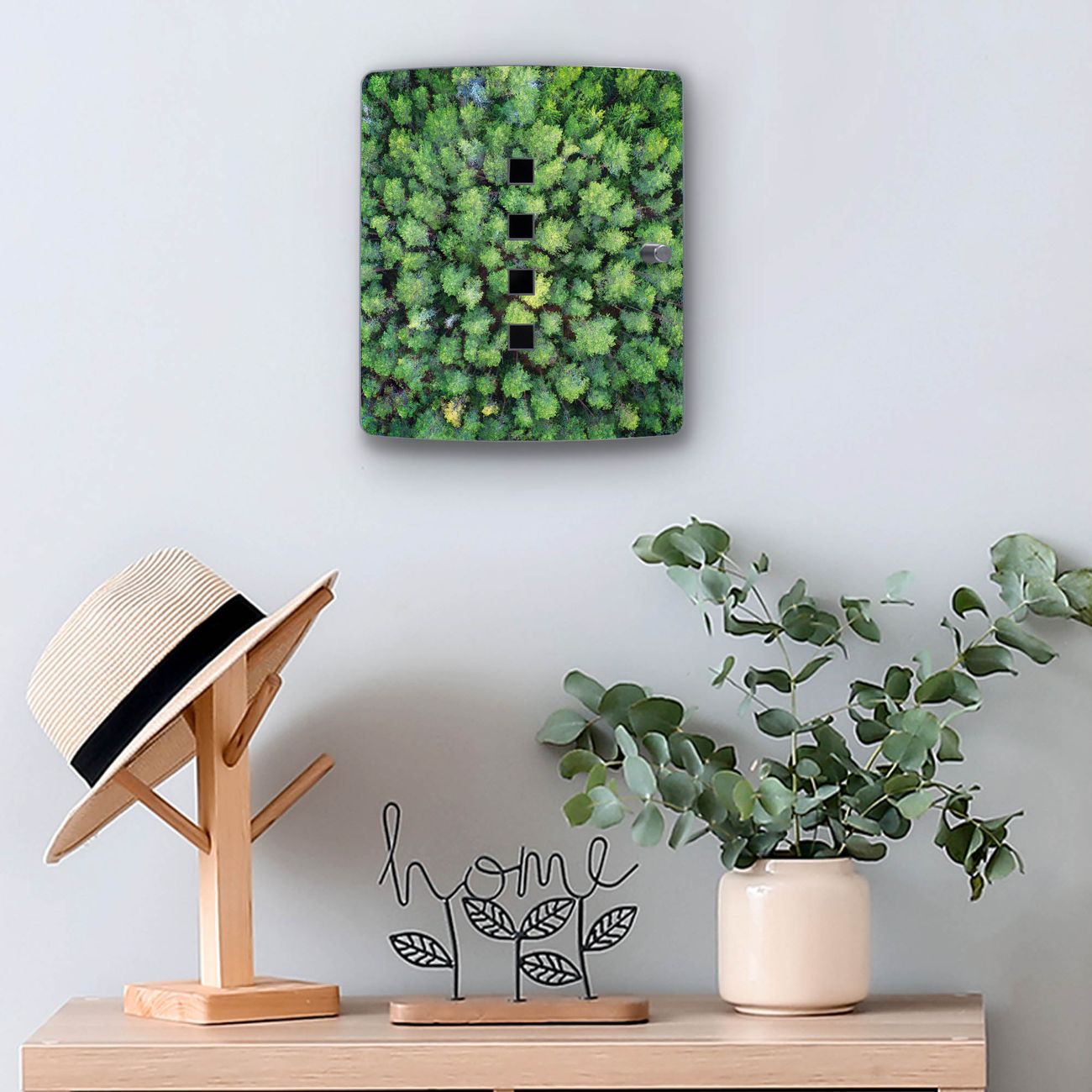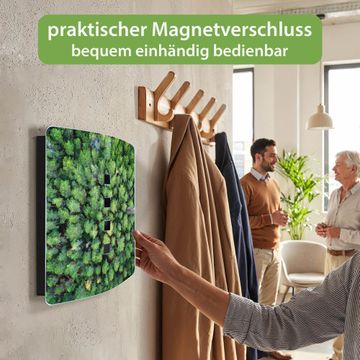 Funktion / Nutzen: Die leicht geschwungene Edelstahltür ist mit einer hochwertigen Motivfolie und dem Motiv Motiv Nadelwald kaschiert. Ein praktischer Magnetverschluss ermöglicht Ihnen ein schnelles Öffnen und Schließen. Befestigt wird der Schlüsselkasten an 2 Stellen auf der Rückseite, passendes Montagematerial fügen wir bereits bei.