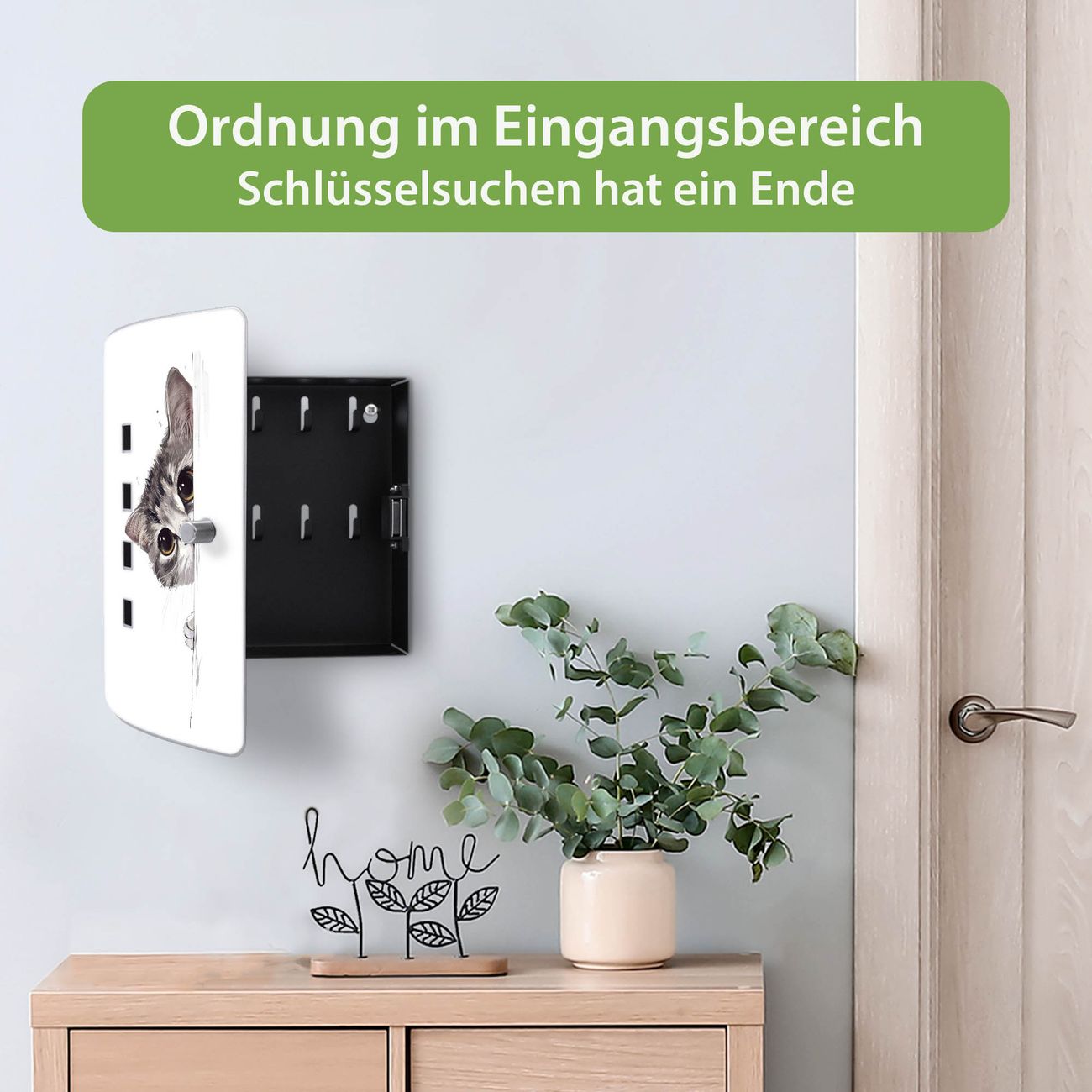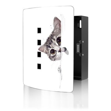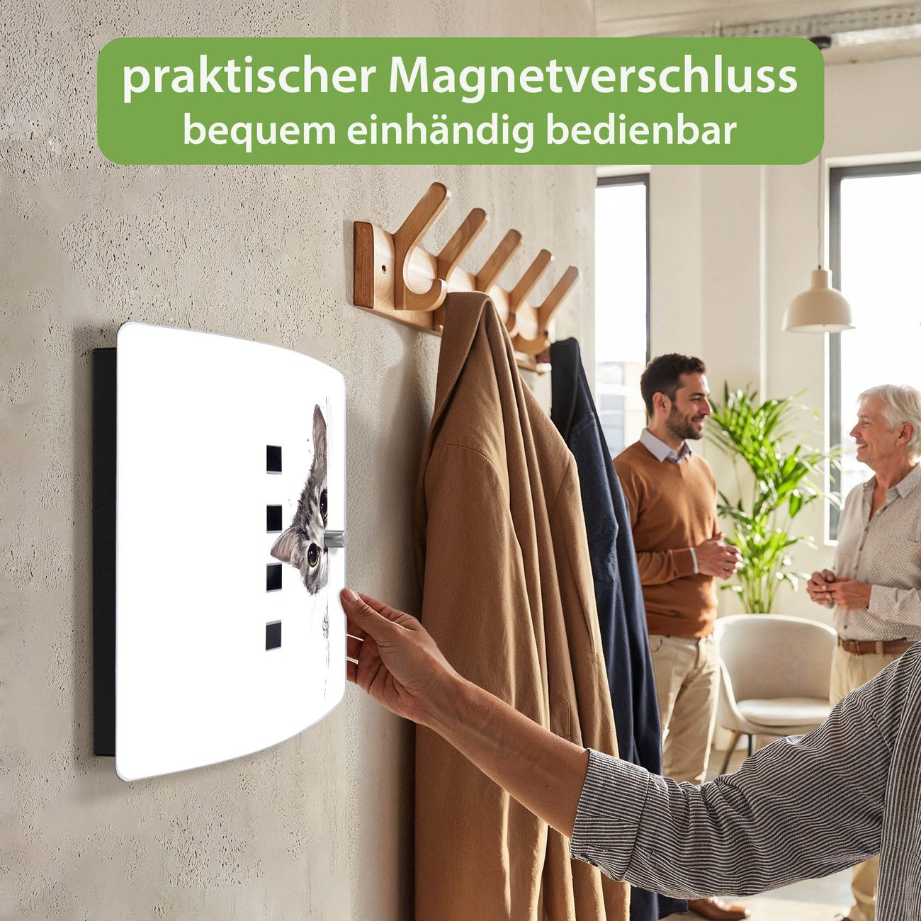 Funktion / Nutzen: Die leicht geschwungene Edelstahltür ist mit einer hochwertigen Motivfolie und dem Motiv Motiv Neugierige Katze kaschiert. Ein praktischer Magnetverschluss ermöglicht Ihnen ein schnelles Öffnen und Schließen. Befestigt wird der Schlüsselkasten an 2 Stellen auf der Rückseite, passendes Montagematerial fügen wir bereits bei.