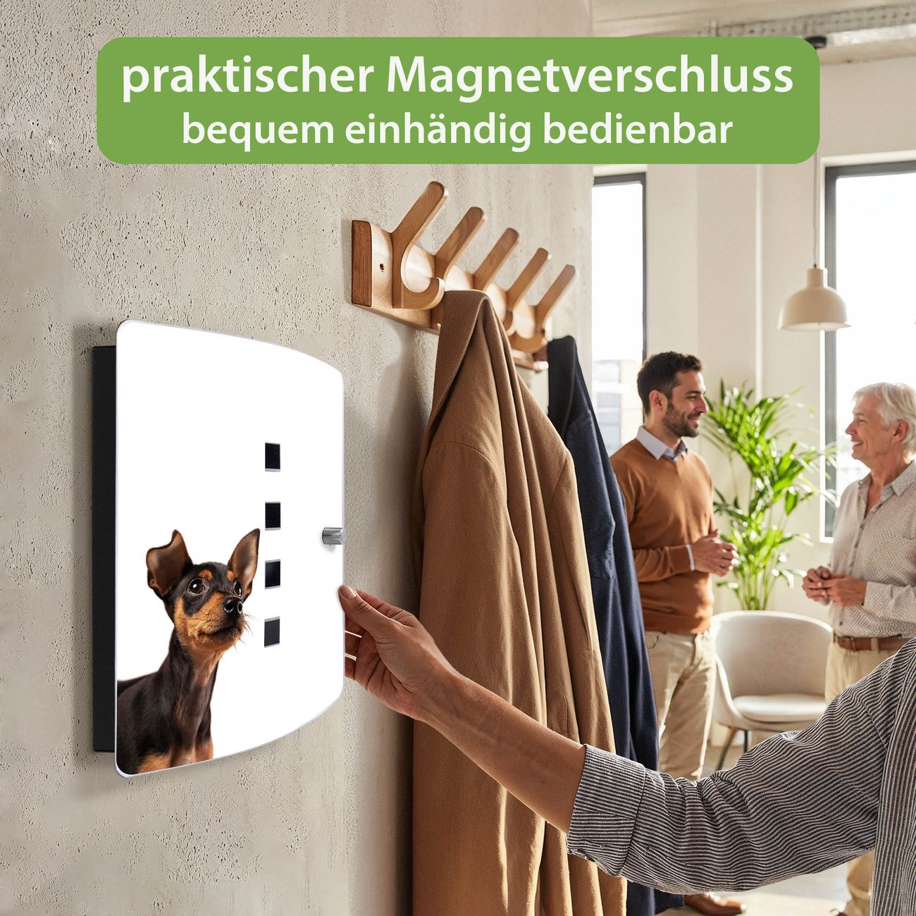 Funktion / Nutzen: Die leicht geschwungene Edelstahltür ist mit einer hochwertigen Motivfolie und dem Motiv Motiv Niedlicher Welpe kaschiert. Ein praktischer Magnetverschluss ermöglicht Ihnen ein schnelles Öffnen und Schließen. Befestigt wird der Schlüsselkasten an 2 Stellen auf der Rückseite, passendes Montagematerial fügen wir bereits bei.