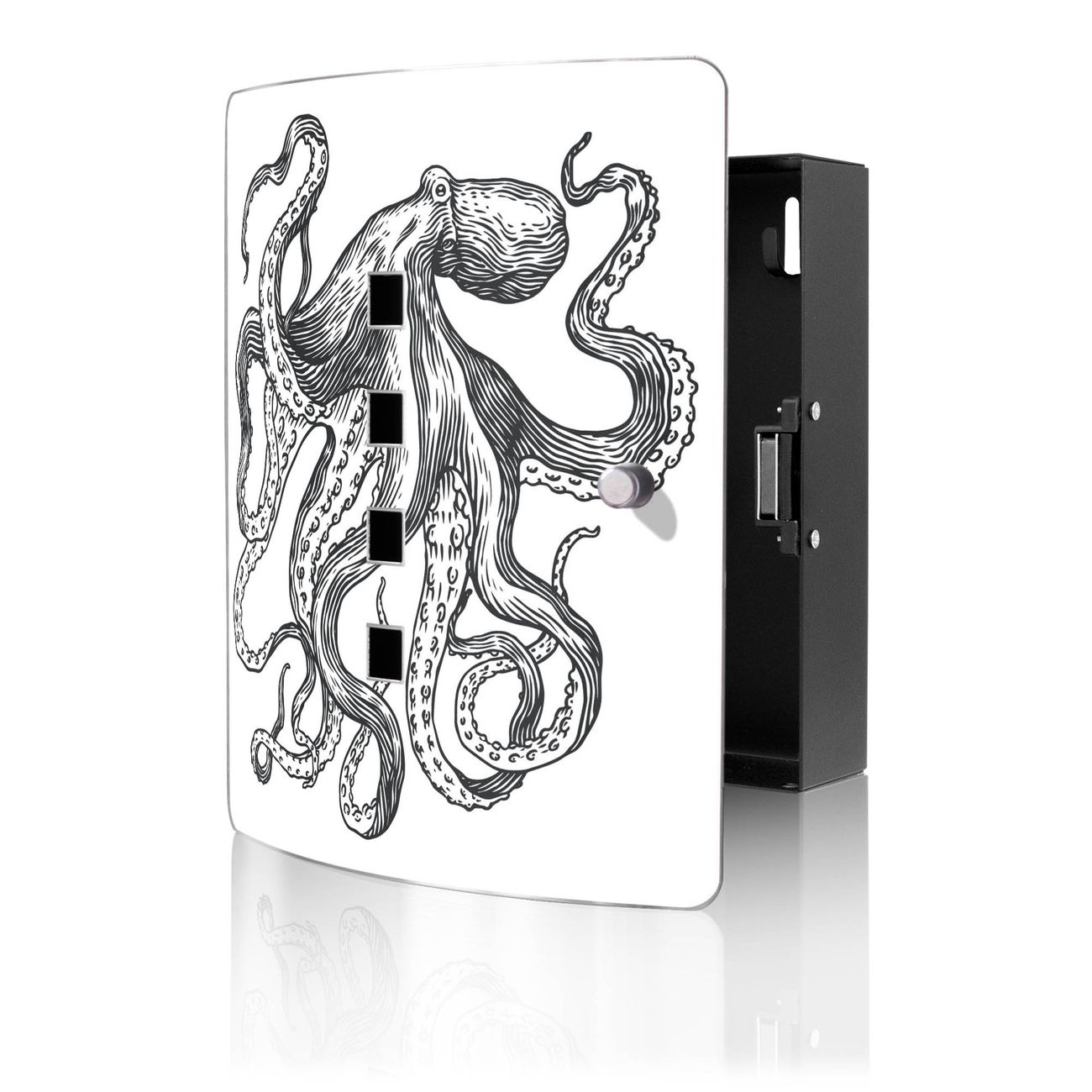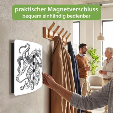 Funktion / Nutzen: Die leicht geschwungene Edelstahltür ist mit einer hochwertigen Motivfolie und dem Motiv Motiv Oktopus 10 kaschiert. Ein praktischer Magnetverschluss ermöglicht Ihnen ein schnelles Öffnen und Schließen. Befestigt wird der Schlüsselkasten an 2 Stellen auf der Rückseite, passendes Montagematerial fügen wir bereits bei.