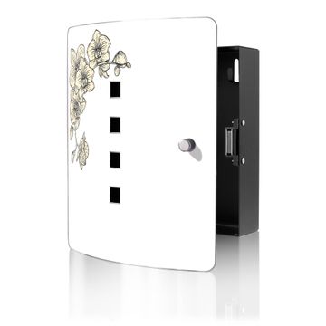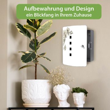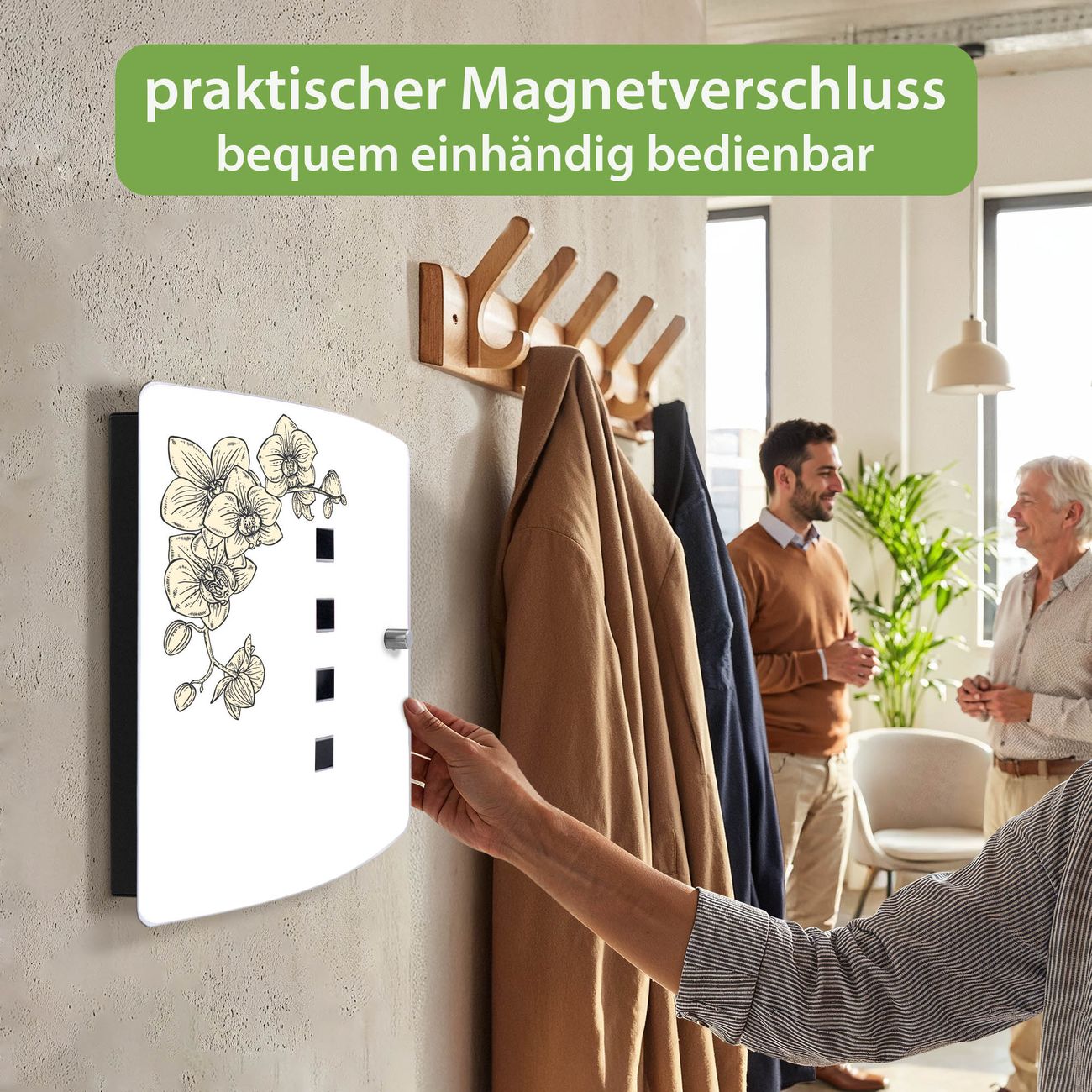 Funktion / Nutzen: Die leicht geschwungene Edelstahltür ist mit einer hochwertigen Motivfolie und dem Motiv Motiv Orchideenzeichnung kaschiert. Ein praktischer Magnetverschluss ermöglicht Ihnen ein schnelles Öffnen und Schließen. Befestigt wird der Schlüsselkasten an 2 Stellen auf der Rückseite, passendes Montagematerial fügen wir bereits bei.