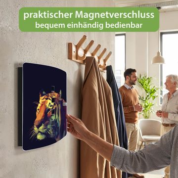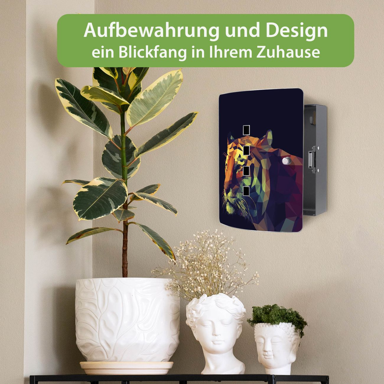 Funktion / Nutzen: Die leicht geschwungene Edelstahltür ist mit einer hochwertigen Motivfolie und dem Motiv Motiv Polygon Tiger kaschiert. Ein praktischer Magnetverschluss ermöglicht Ihnen ein schnelles Öffnen und Schließen. Befestigt wird der Schlüsselkasten an 2 Stellen auf der Rückseite, passendes Montagematerial fügen wir bereits bei.