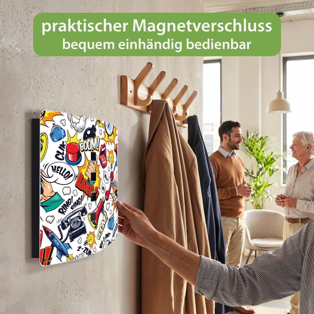 Funktion / Nutzen: Die leicht geschwungene Edelstahltür ist mit einer hochwertigen Motivfolie und dem Motiv Motiv Pop-Art Comic Muster kaschiert. Ein praktischer Magnetverschluss ermöglicht Ihnen ein schnelles Öffnen und Schließen. Befestigt wird der Schlüsselkasten an 2 Stellen auf der Rückseite, passendes Montagematerial fügen wir bereits bei.