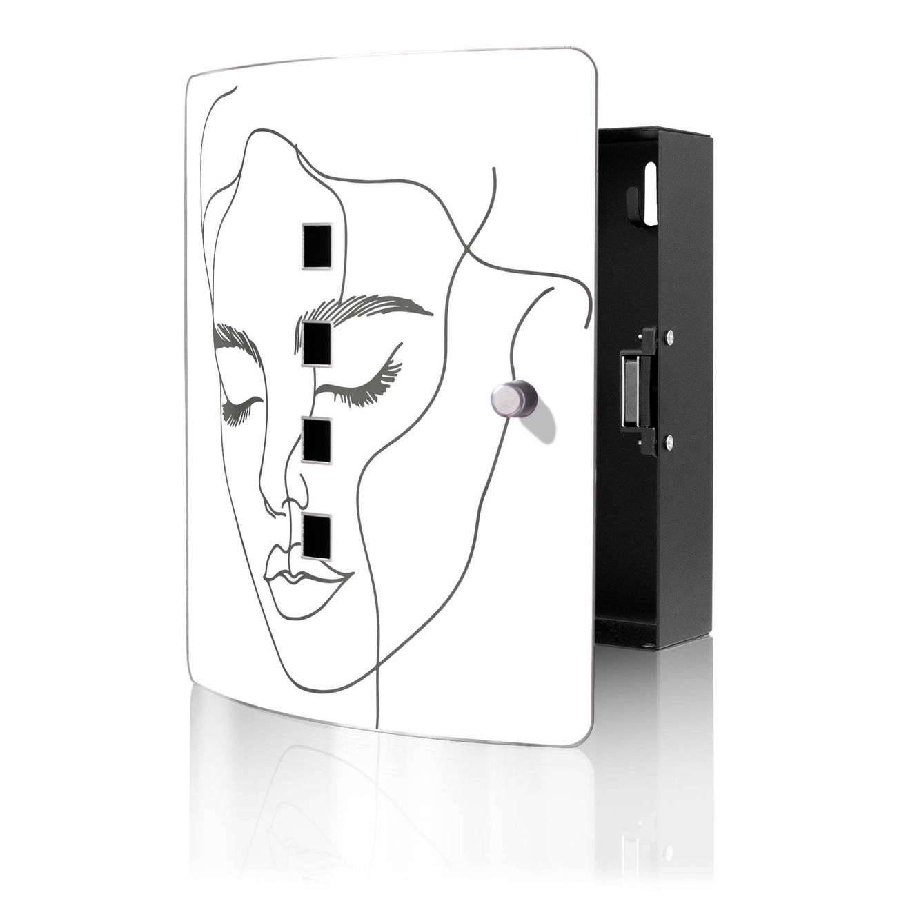 Funktion / Nutzen: Die leicht geschwungene Edelstahltür ist mit einer hochwertigen Motivfolie und dem Motiv Motiv Portrait Lineart kaschiert. Ein praktischer Magnetverschluss ermöglicht Ihnen ein schnelles Öffnen und Schließen. Befestigt wird der Schlüsselkasten an 2 Stellen auf der Rückseite, passendes Montagematerial fügen wir bereits bei.