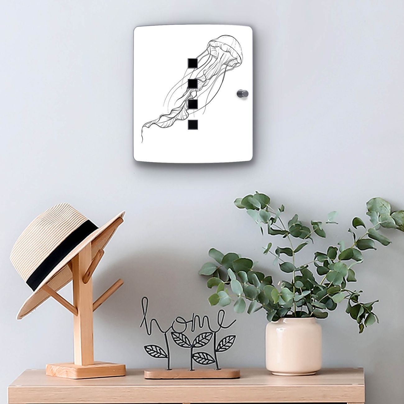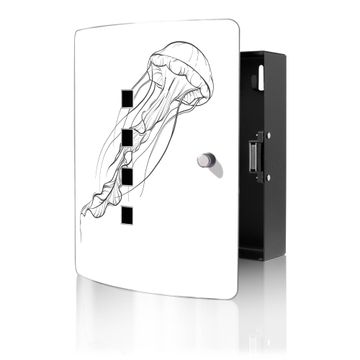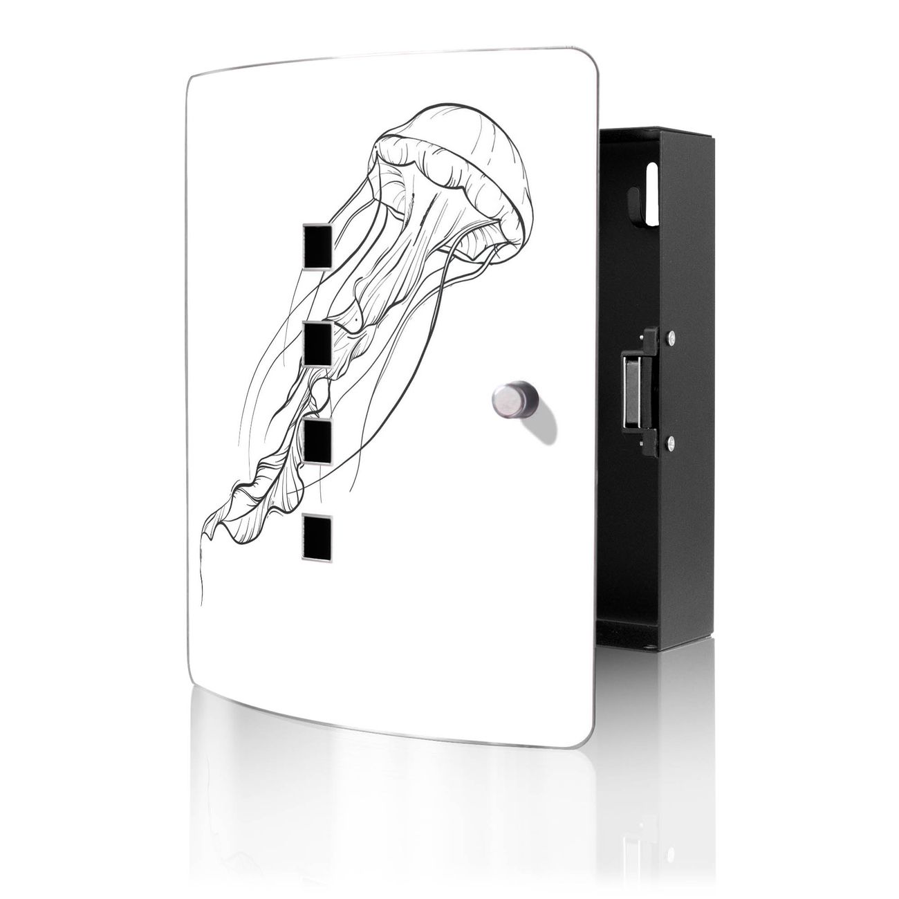 Funktion / Nutzen: Die leicht geschwungene Edelstahltür ist mit einer hochwertigen Motivfolie und dem Motiv Motiv Qualle 4 kaschiert. Ein praktischer Magnetverschluss ermöglicht Ihnen ein schnelles Öffnen und Schließen. Befestigt wird der Schlüsselkasten an 2 Stellen auf der Rückseite, passendes Montagematerial fügen wir bereits bei.