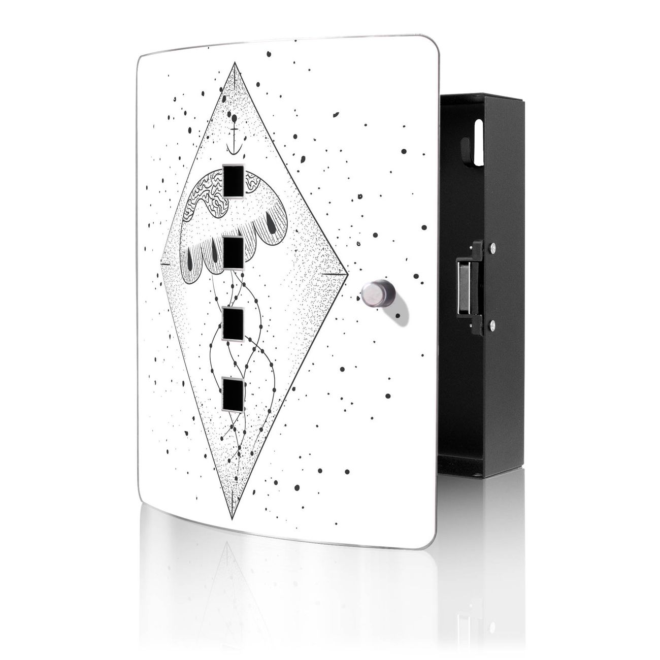 Funktion / Nutzen: Die leicht geschwungene Edelstahltür ist mit einer hochwertigen Motivfolie und dem Motiv Motiv Quallenprisma 2 kaschiert. Ein praktischer Magnetverschluss ermöglicht Ihnen ein schnelles Öffnen und Schließen. Befestigt wird der Schlüsselkasten an 2 Stellen auf der Rückseite, passendes Montagematerial fügen wir bereits bei.