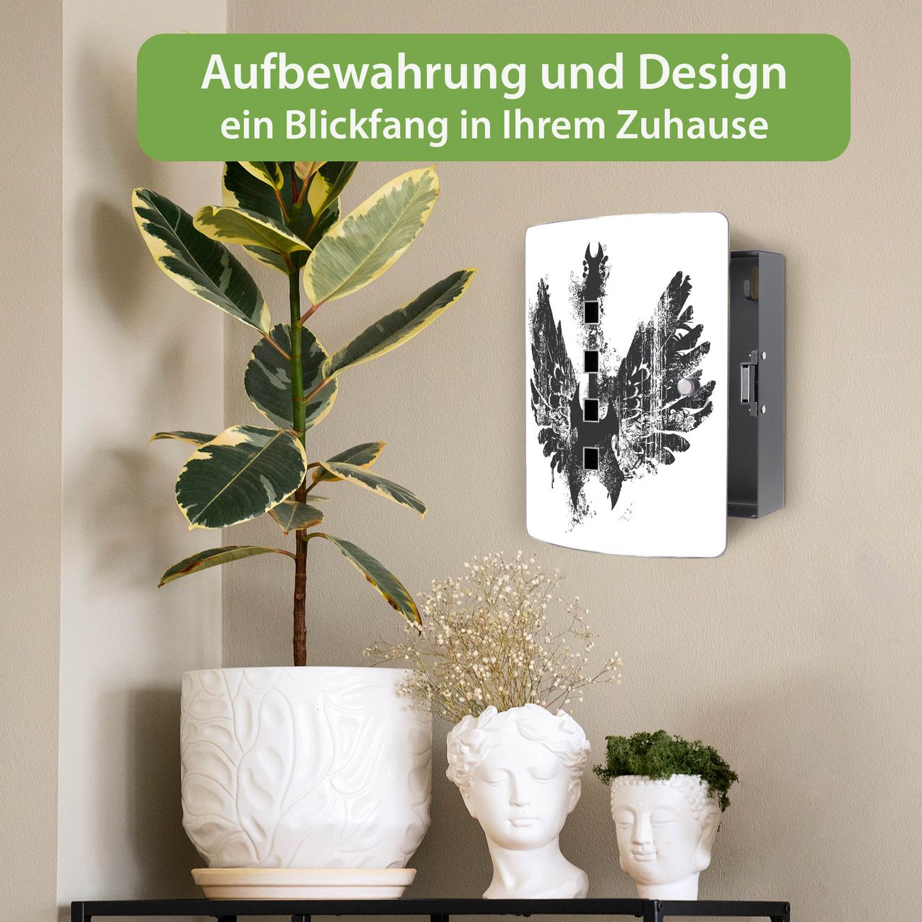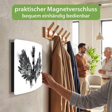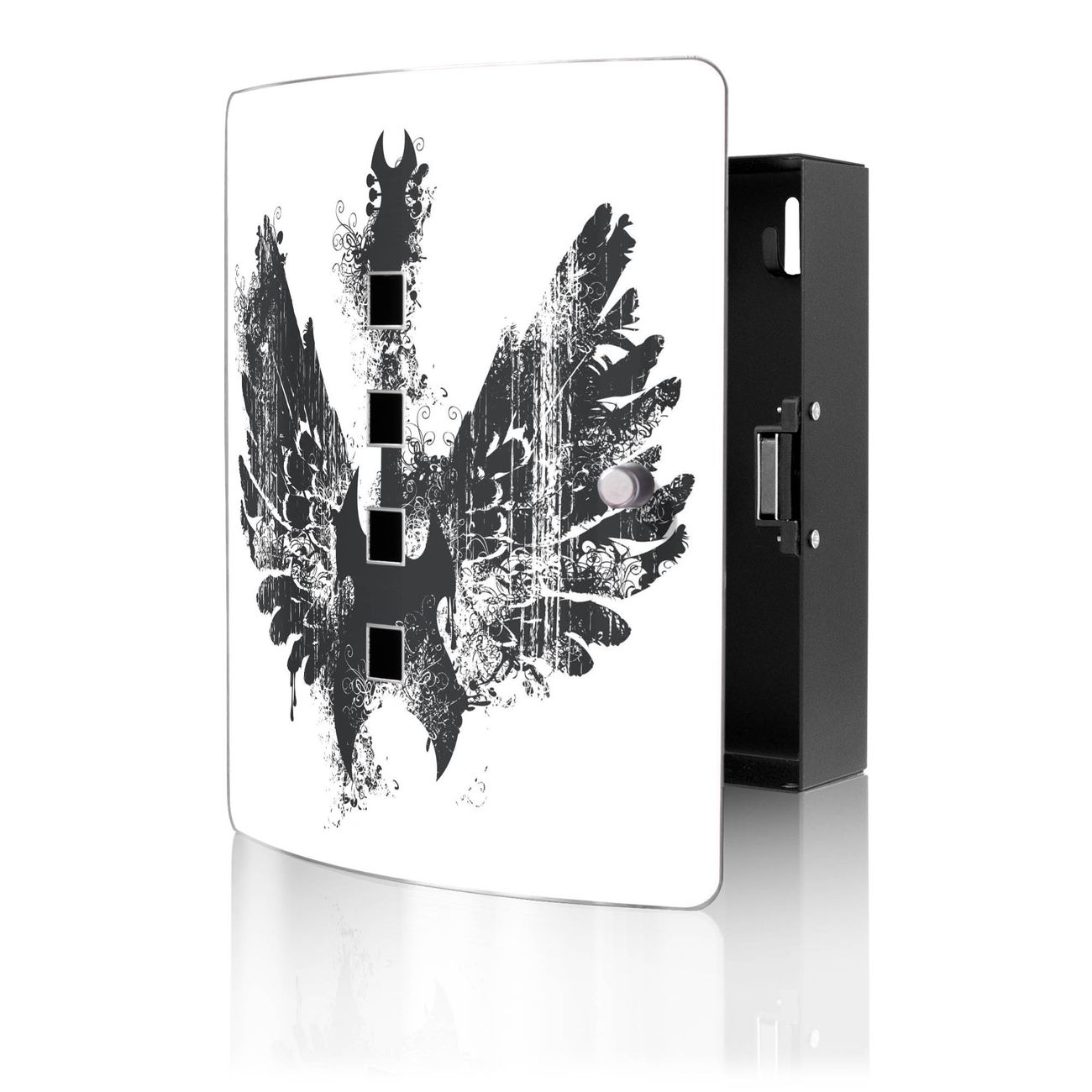 Funktion / Nutzen: Die leicht geschwungene Edelstahltür ist mit einer hochwertigen Motivfolie und dem Motiv Motiv Rock Gitarre Flügel kaschiert. Ein praktischer Magnetverschluss ermöglicht Ihnen ein schnelles Öffnen und Schließen. Befestigt wird der Schlüsselkasten an 2 Stellen auf der Rückseite, passendes Montagematerial fügen wir bereits bei.